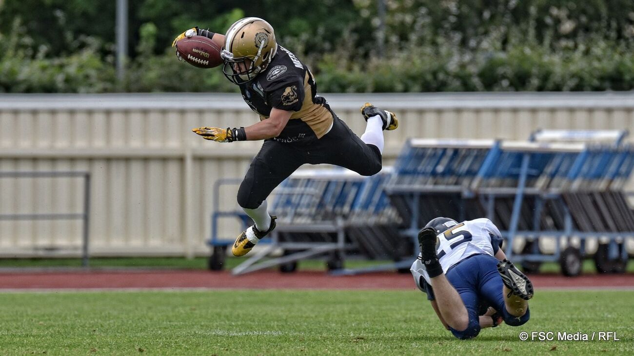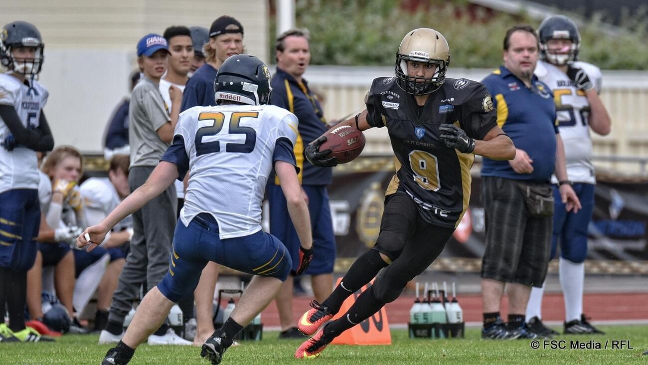 ![]() Ottelun parhaan palkittu Daniel Luoma teki heittopeleistä kaksi touchdownia ja potki lisäksi viisi lisäpistettä. Kuva: FSC Media / Riku Flink ![]() Joukkueiden parhaimpiin kuuluivat lauantaina Butchersin keskushyökkääjä Kristian Metsämäki sekä Wolverinesin ahkerin taklaaja Aleksi Kylli. Kuva: FSC Media / Riku Flink ![]() Rasmus Kontio (vas.) näyttää suuntaa, kun Jere Paananen on ottanut yhden kolmesta syötönkatkostaan. Kuva: FSC Media / Riku Flink |