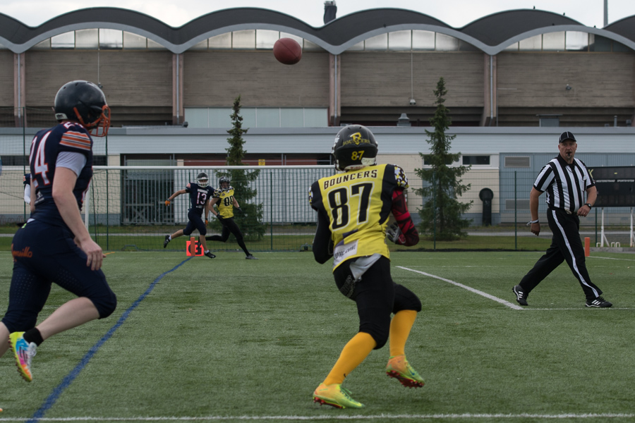 Pori Bears – Mikkeli Bouncers 41–20 (13–20) Porissa lauantaina pelatussa ottelussa hallinta aaltoili ottelun alussa, mutta toisella puoliajalla kotijoukkue otti valtikan itselleen ja vei kaksi viimeistä neljännestä nimiinsä lukemin 28–0. Keskushyökkääjä Juhani Kaskisto avasi kotijoukkueen maalihanat ja hetkeä myöhemmin Tommy Oksa palautti syötönkatkon maaliin. Vierasjoukkue Bouncers ei tästä kuitenkaan pelästynyt, vaan iski kolme seuraavaa touchdownia. Mikkeliläisten kirin aloitti Erkka Korhonen, joka Roni Pöntisen blokkien takaa löysi heti seuraavasta aloituspotkusta tilaa viedä pallon maaliin.Hetkeä myöhemmin Ville Roposen syötönkatkon jälkeen Bouncers-pelinrakentaja Henri Heiskanen löysi maalialueelta Olli Karhun, joka potkaisi myös lisäpisteen haarukkaan. Tilanne vieraille 13–14. Sama kaksikko, Heiskanen–Karhu, rakensi ennen puoliaikaa vielä yhden osuman, joten tilanteessa 13–20 ottelu siirtyi tauolle. Toisella puoliajalla Joni Kotron johdolla Bears sai mikkeliläishyökkäyksen kuriin ja samaan aikaan pelinrakentaja Nicholas Sandhu ohjasti hyökkäyksensä neljä kertaa maalialueelle. Samu Sjövall teki kaksi touchdownia ja Teemu Jokinen yhden. Lisäksi Kaskisto juoksi vielä toisen osumansa. Päätösneljännes alkoi vielä tasatilanteessa 20–20, mutta sen jälkeen kotijoukkueen tehoneljännes käänsi ottelun lopulllisesti kotijoukkueelle. Katso myös: Kuvia ottelusta (Pekka Paljakka / UrheiluSuomi.com)