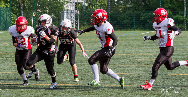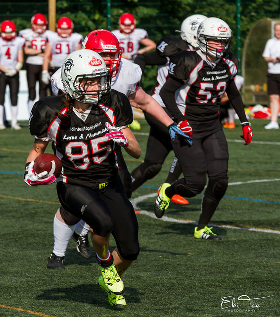 ![]() Trojansin nopea hyökkääjä Jutta Luhtala (85) pelaa hyökkäyksessä sekä laitahyökkääjänä että keskushyökkääjänä. Välierässä Pietari Valkyriesiä vastaan Luhtala teki reilun 70 jaardin touchdownin lentopotkaisijan paikalta. Kuva: Eki Tanskanen |