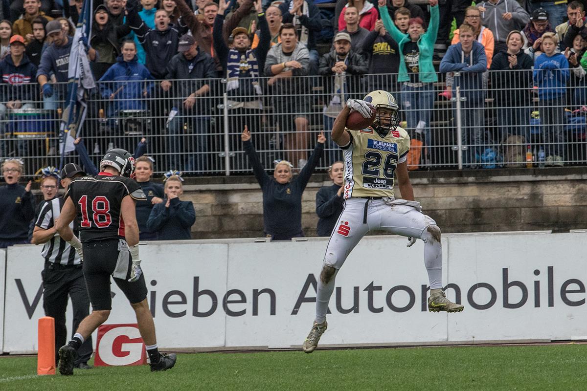 Dresden Monarchs murskasi Saarland Hurricanesin puolivälierässä Saksan pääsarjan, GFL:n "suomalaisseura" Dresden Monarchs oli vakuuttava sunnuntaina pelatussa puolivälieräottelussaan Saarland Hurricanesia vastaan. Loppulukemat kallistuivat Monarchsille 43–7 (29–0). Suomalaiskolmikko Micky Kyei, Sebastien Sagne ja Santeri Inkinen kuuluivat joukkueensa aloituskokoonpanoon. Sagne teki yhden touchdownin, Kyei oli kolmella kiinniotollaan joukkueensa ahkerin koppaaja ja Inkinen keräsi kuusi taklausta ollen jälleen joukkueensa kärkipuolustajia. Jo ennen ottelua suomalaiskolmikko uhkui itsevarmuutta eikä suureksi revennyt voittomarginaali syntynyt trion mukaan vahingossa. – Ainakaan minulle ei pelin lopputulos ollut mikään yllätys, Inkinen toteaa. – Uskoin, että hyvä valmistautuminen ja pelin aikainen keskittyminen riittää voittoon, mikä tietysti tällä kertaa tuli selvillä lukemilla. – Meidän puolustus teki tärkeitä pysäytyksiä ensimmäisellä puoliajalla (esim. 4. yritys ja 2-3y maaliin) ja luottamus omaan tekemiseen vain kasvoi. Päätösneljänneksen maalikin tuli pitkällä pelillä ja puolustuksen niin sanotun hyvänolon tunteen vuoksi. Vastustaja sai kyllä myös pitkiä draiveja mutta pystyimme pitämään vastustajan noissa 7 pisteessä loppuun asti. Sagne ja Kyei olivat runkosarjassa liigan tehokkaimman hyökkäyksen kulmakiviä, mutta pudotuspeleissä heittopelin tai avainhyökkääjien ei tarvinnut venyä runkosarjan tehoihin. Poikkeuksellisesti Monarchs eteni juosten heittoa enemmän (188 j. – 142 j.) ja lisäksi päävalmentaja John Leijten otti ykköspelaajiaan jo varhaisessa vaiheessa sivuun. – Hyökkäyksen kannalta oli aika juoksupainotteinen peli. Vastustajan puolustajat oli aika pieniä äijiä, Kyei kommentoi. Hyökkäyksen linja raivasi keskushyökkääjä Donald Russellille leveitä juoksuväyliä, jotka huippukeskushyökkääjä myös hyödynsi juoksemalla yli 9 jaardin keskiarvolla 127 jaardia ja tehden yhden touchdownin. Pelinrakentaja Brandon Connette juoksi itse kaksi maalia. Lisäksi Connette heitti yhden osuman Russellille. Toisesta Dresdenin heittomaalista vastasi Sagne, joka toisella neljänneksellä nosti Monarchsin 21–0 -johtoon 13-jaardisella kiinniotolla. – Ei kovin paljoa edes oltu kentällä, koska hyökkäysdraivit päättyivät nopeisiin maaleihin ja vastustaja juoksi kellosta aika paljon aikaa pois, Sagne itse kuvasi sunnuntain ottelun hyökkäystoimintaa.
