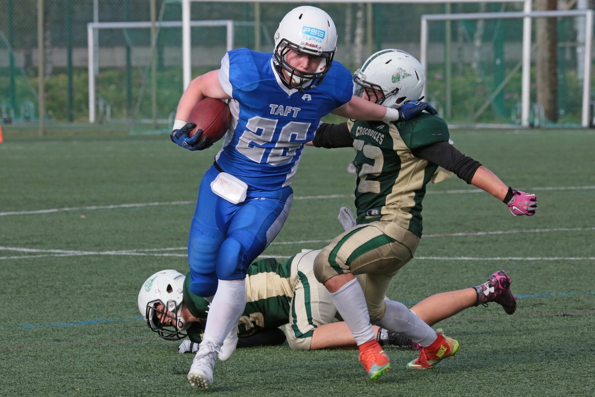 TAFT haluaa venyttää kenttää ja edetä monipuolisestiSinivalkoinen vantaalaisjoukkue TAFT on pelannut nousujohteisen kauden. Neljästä ensimmäisestä ottelusta TAFT keräsi vain kaksi voittoa, mutta tuon jälkeen ainoa tappio oli runkosarjan viimeinen koitos Roostersia vastaan. Runkosarjan jälkimmäisellä puoliskolla TAFT antoi vastustajalle vähiten pisteitä. Pelinrakentamisen vastuu TAFT:ssa on jakautunut Joona Collierin ja Jesper Korkalaisen välille. Työpanos on muutoinkin ollut tasapainossa useammankin pelaajan harteilla. – Hyökkäyksessämme käytämme spread-muotoa niin kuin moni muukin tämän sarjan joukkue, Mark Collier kertoo. – Pyrimme pelaamaan juoksua ja heittoa yhtä paljon. Juoksupelissä keskushyökkääjät Otso Bull ja Severi Partanen ovat tärkeimmät etenijät. Ketkä laitahyökkääjistä ovat heittopelin tärkeimmät kohteet? – Toivottavasti kaikki! Collier sanoo ja korostaa johdonmukaisesti monipuolisuutta. Roostersin puolustuksesta huomio on runkosarjan osalta kiinnittynyt puolustuksen linjan päätyihin, jossa Edward Vesterinen ja Turkka Västrik ovat ajoittain kahdestaan tuhonneet vastustajan pelisuunnitelman. Päävalmentaja Koikkalaisen mukaan kaksikko on kahdeksassa runkosarjapelissä kerännyt yhteensä 40 pelinrakentajasäkitystä. – Linjallamme on töitä heidän pysäyttämisessään. He eivät saa murtautua meidän linjan ohi, Collier sanoo ja jatkaa aiheeseen liittyen. – Siitä syystä meidän myös pystyttävä juoksemaan pallon kanssa. Roostersissa uskotaan, että vantaalaisten pelisuunnitelmassa tullaan näkemään radikaaleja muutoksia finaaliin lähdettäessä. – Spread ei ole paras muoto Vesteristä ja Västrikiä vastaan. Luulen, että sieltä tulee jonkinlaista voimakasta hyökkäysmuotoa.