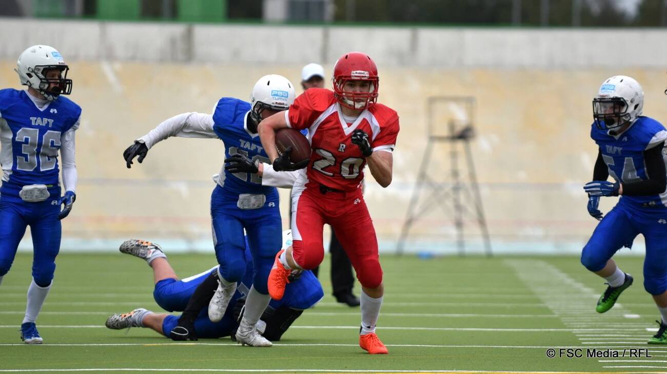 ![]() Oliver Jyväsjärvi teki finaalissa kolme touchdownia, joista ensimmäisen suoraan aloituspotkusta. Kuva: FSC Media/Riku Flink ![]() Turkka Västrik (vas.) antamassa painetta TAFT:n pelinrakentajana aloittaneelle Joona Collierille. Kuva: FSC Media/Riku Flink |