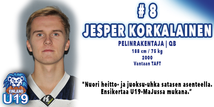 Suomen nuorelta pelinrakentajalta löytyy kokemusta Ruotsin kaadosta Suomen U17 leijonanuoriso matkaa lauantaina 29.10. Arlandaan, jossa joukkue pelaa ystävyysottelun rakasta naapuriamme Ruotsia vastaan. Suomi voitti Pohjoismaiden mestaruuden 19-vuotiaiden sarjassa viime viikolla, ja nyt kentälle on vuorossa 17-vuotiaiden maajoukkue. Tänä vuonna U17-joukkue ei pelaa PM-kisoja, mutta leijonanuoret lähtevät hakemaan ottelusta tärkeää pelikokemusta. Pelaajaesittelyssä alla U17-nuorten pelinrakentaja Jesper Korkalainen, jolla on kokemusta Ruotsin kaadosta. Miten oma sarjakautesi meni? "Sarjakausi meni hyvin. Positiivista oli että pääsimme finaaliin asti, mutta negatiivista oli että hävisimme sen finaalipelin." Mitä odotat tulevalta Ruotsi ottelulta? "Odotan tiukkaa ja vauhdikasta ottelua. Vähäinen yhdessä harjoittelu luo haasteita maajoukkuepelaamiseen, mutta uskon että saamme pelimme toimimaan." Miten valmistaudut otteluun? "Peliin valmistautumiseeni kuuluu musiikin kuuntelu, keskittyminen ja hyvä kropan herättelevä alkuverryttely." Mitkä ovat vahvuutesi pelinrakentajana? Mitä haluat kehittää itsessäsi? "Monipuolisuus. Juoksu- sekä heittouhka. Kykenen suoriutumaan hyvin tiukassakin tilanteessa. Kehittämistä löytyy jokaiselta osa-alueelta, etenkin jalkatyöstä." Mikä motivoi olemaan parempi? "Minua motivoi intohimo lajiin, halu kehittyä ja olla parempi koko aika. Tavoitteena päästä pelaamaan jenkkeihin yliopistoon." Kuka on paras pelaaja pelipaikallasi? "Idolini on Cam Newton. Pelityylimme on samankaltaista." Mikä on pelinrakentajan hommassa haastavinta, mikä on parasta? "Haastavinta on se että hyökkäys pelaamisen onnistuminen on hyvin usein pelinrakentajan suorituksesta kiinni. Parasta on pelitilanteessa oleminen ja pelaaminen."