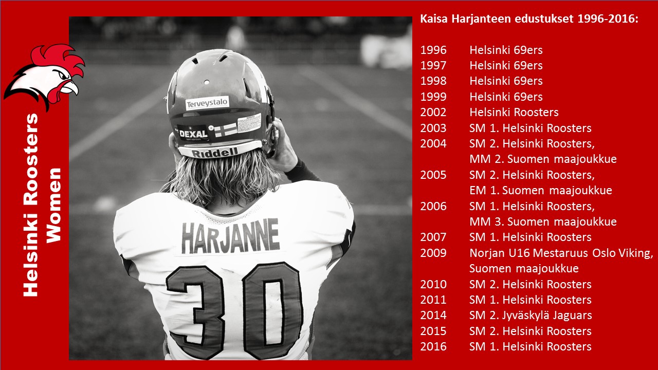 Roosters Women jäädytti lauantaina numeron 30 Vuonna 1996 Kaisa Harjanteen urheiluelämä oli yhtä kuin jääkiekko. Lätkän SM-sarjaa Karhu-Kissoissa ja IHK:ssa läpikäynyt pelaaja oli tottunut harjoittelemaan ja pelaamaan. Kesäkaudelle 20 vuotta sitten jääkiekkojoukkueen päävalmentaja oli kuitenkin kehittänyt jotakin uutta: lippupallon. – Se oli koko joukkueen juttu, Harjanne muistelee. – Valmentaja varoitteli, että lippupallo on haastava ja vaikea laji. Tuo jääkiekkovalmentaja oli Kaj Lindblad - nykyinen amerikkalaisen jalkapallon U17-maajoukkueen päävalmentaja. Juuri Lindbladin vuoksi Harjanteen jääkiekkojoukkueesta tuli kesällä 1996 Helsinki 69ersin ensimmäinen naisten joukkue. – Ajattelimme, että jos nyt jokunen peli voitettaisiin. 1990-luvulla naisten SM-sarja jakautui kolmeen selkeään valtakauteen. Ensin sarjaa hallitsi helsinkiläinen ECG, sitten Espoo Colts ja vuosikymmenen loppupuolella valtikka oli Jyväskylässä. Vuosina 1996–1999 oli 69ers kuitenkin mitaleilla useamman kerran. 69ersin joukkueessa pelasivat Harjanteen useita tulevia tähtipelaajia, muun muassa SM-sarjassa ja maajoukkueessa loistaneet Merita Bruun ja Ulla Repo. Lippupallo eli semi-kontakti-jenkkifutis oli tuossa vaiheessa Harjanteelle kakkoslaji, jota pelattiin kesällä oheispelinä. Kauden 1999 jälkeen hän panosti enemmän jääkiekkoon ja osittain myös Saksaan muuton vuoksi laji jäi syrjään muutamaksi vuodeksi.