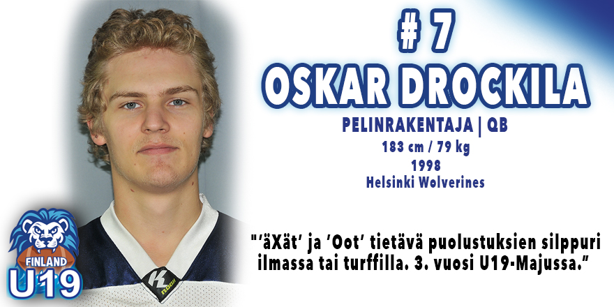 Nuorten maajoukkueen pelinrakentaja kesäsuunnitelmat menivät uusiksi yhdessä illassa Nuorten maajoukkueen pelinrakentaja Oskar Drockila on Tsekin liigassa pelaavan Ostrava Steelersin uusi pelinrakentaja. Helsinki Wolverinesia viime kaudella edustanut Drockila, 18, ja Steelers ovat solmineet kautta 2017 koskevan pelaajasopimuksen. Drockilan siirtokuvio Tsekkeihin ei ole tyypillisimmästä päästä. Steelersillä ilmeni sopimusteknisiä ongelmia islantilaispelinrakentajan kanssa muutama viikko sitten, ja joukkueessa laitahyökkääjänä toimiva Teemu Rantanen ehdotti Drockilan nimeä. Rantanen pelasi yhdessä Drockilan kanssa jo vuosi sitten Wolverinesin I-divisioonajoukkueessa. Rantasen suosituksesta hyökkäyksen koordinaattori Luke Wildung otti yhteyttä Suomeen. Tämän jälkeen prosessi vyöryi maaliin nopeasti. Drockila sai ensimmäisen viestin tiistaina ja jo torstai-iltana hän oli Ostravassa. – Tiistaina kysyin asiaa äidiltä ja isältä, ja illalla treeneissä juttelin Wolverinesin joukkueenjohdon ja valmennuksen kanssa, 18-vuotias Drockila kertoo. – Kotoa tuli lupa ja treeneissä kannustettiin lähtemään. Keskiviikkona selvitystyö jatkoi lukiossa. – Keskustelin opinto-ohjaajan kanssa. Käyn muutenkin lukion neljässä vuodessa, mutta nyt kevään aikana hoidan netin kautta verkkokursseja. Keskiviikkona viimeisetkin seikat olivat kunnossa. Drockila lupasi lentää Tsekkeihin heti torstaina. Tuossa vaiheessa Helsinki 69ers -kasvattia oltiin vielä asettamassa aloittavaksi pelinrakentajaksi sunnuntaina sarja-avaukseen. – Torstaina olivat viimeiset kunnon treenit, mutta missasin ne, koska saavuin maahan vasta illalla. Kaiken lisäksi siirtopaperit eivät olleet Tsekin päässä kunnossa ennen peliä. – Toisaalta lauantaina oli vain kevyt walk through –harjoitus, ja olisin joutunut peliin tietämättä edes kaikkia, kenen kanssa pelaan.