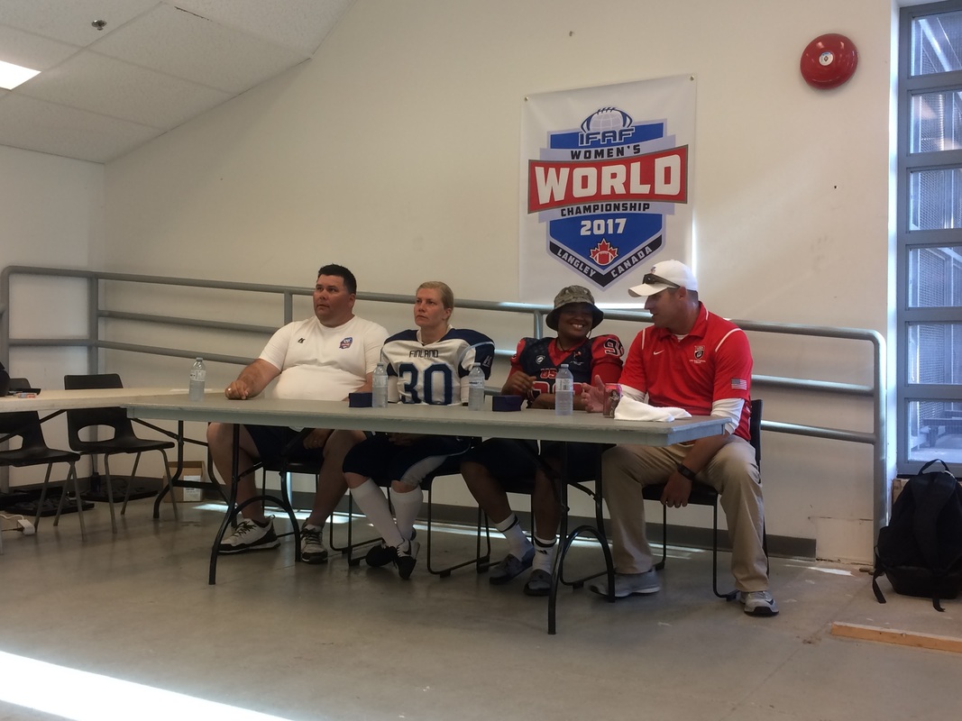 Turnaus jatkuu Suomen osalta perjantaina sijoitusottelulla Australiaa vastaan. Suomi kohtasi kaksinkertaisen maailmanmestarin, Yhdysvallat amerikkalaisen jalkapallon MM-kisoissa tiistain ja keskiviikon välisenä yönä . Ottelu päättyi Yhdysvaltojen 48 – 0 –voittoon. Voitolla Yhdysvallat jatkaa kisojen finaaliin ja Suomi pelaa perjantaina sijoista 5.-6. Ottelu alkoi molempien vahvalla puolustuspelaamisella, eikä ensimmäisellä neljänneksellä nähty pistesuorituksia kummaltakaan joukkueelta. Ensimmäiset pisteet saatiin taululle kuitenkin heti toisen neljänneksen aluksi, kun Yhdysvallat pakotti Suomen luopumaan pallosta lentopotkulla oman maalialueen tuntumassa ja Kimberly Marks onnistui blokkaamaan potkun päätyrajasta yli vieden USA:n 2 – 0 –johtoon. Seuraavalla hyökkäysvuorolla Yhdysvaltojen pelinrakentaja Sami Grisafe onnistui löytämään maalialueelta laitahyökkääjä Jeanette Grayn ja lisäpistepotkun onnistuessa Yhdysvallat siirtyi 9 – 0 –johtoon. Ashley Whisonant nauttiessa välissä kerran pistesuorituksen huumasta, onnistuivat amerikkalaiset toisen neljänneksen loppupuolella jälleen blokkaamaan lentopotkun ja pääsivät hyökkäämään läheltä maalialueelta. Vahvaksi juoksijaksi tiedetty Hannah DeGraffinreed juoksi pallon maalin ja lisäpistepelin epäonnistuessa Yhdysvalloilla johto 21 – 0. Aivan ensimmäisen puoliaja lopussa myös Suomi oli onnistua pistesuorituksessa, kun Kirsti Nirhamo oli erittäin lähellä saada Jonna Hakkaraisen heiton kiinni maalialueella. Valitettavasti Suomen pistetili jäi kuitenkin tässä ottelussa avaamatta. Toisella puoliajalla amerikkalaisten tahti kiristyi ja maalialueelle pallon kanssa ehtivät niin pelinrakentaja Lisa Horton, laitahyökkääjä Angela Baker sekä keskushyökkääjät Alexis Snyder ja Erica Mois. Yhdysvallat kierrätti Suomea vastaan pelaajia Meksiko-ottelun tapaan ja kuten pistesuorituksia tehneiden pelaajien listasta näkyy, tuli onnistumisia monelle pelaajalle. Yhdysvallat peluutti ottelussa myös kaikki kolmea pelinrakentajaansa eikä se juuri heidän pelissään näkynyt. Suomen puolustus onnistui pitämään erityisesti amerikkalaisten juoksupelin kurissa ja tästä myös Yhdysvaltojen päävalmentaja Jim Farrel antoi tunnustusta Suomelle: - Suomalaiset puolustivat juoksuamme äärimmäisen hyvin ja jouduimme siksi avaamaan heittopeliämme hieman suunniteltua enemmän. Suomi pelasi hyvin yhteen joukkueena niin puolustuksessa kuin hyökkäyksessäkin ja he taistelivat hienosti. Suomen joukkue on hyvin valmennettu. Ilman muutamia hienoja onnistumisiamme erikoispeleissä peli olisi myös ollut aivan eri peli. Ottelun jälkeen Suomen päävalmentaja Mika Eloranta oli ylpeä joukkueen otteista: - Tiesimme ennakkoon, että tämä tulee olemaan erittäin kova ottelu, mutta joukkueemme otti haasteen vastaan ja nautti pelin jokaisesta hetkestä. Olen ylpeä siitä miten joukkue panosti tähän otteluun. Halusimme antaa jenkeille mahdollisimman kovan vastuksen ja ainakin ensimmäisellä puoliskolla siinä mielestäni onnistuimmekin hyvin. - Lentopotkut olivat tänään meille iso kompastuskivi ja valitettavasti niissä annoimme vastustajalle aivan liian hyviä kenttäasetelmia. Ei peli pelkästään niihin kuitenkaan ratkennut, Eloranta jatkoi. Suomen parhaana pelaajana palkittu puolustuksen tukimies Tiina Möttönen oli tappiosta huolimatta nauttinut pelistä: - On hienoa pelata kovia pelejä kovia joukkueita vastaan. Olemme hävinneet nyt kahdesti, mutta pelaaminen on silti ollut hauskaa. Suomen ottelut jatkuvat perjantaina sijoitusottelulla Australiaa vastaan. Australia osallistuu arvokisoihin ensimmäistä kertaa ja he ovat hävinneet kisoissa Kanadalla 31 – 6 sekä Meksikolle 31 – 10. - Valmennus aloittaa valmistautumisen seuraavaan otteluun samantien ja huomenna (keskiviikkona) joukkue aloittaa valmistautumaan niin videosession kuin harjoitustenkin äärellä. Pelaajat ovat kunnossa ja saamme koko joukkueen kasaan perjantain sijoitusotteluun Australiaa vastaan. Yhdysvaltojen joukkueesta parhaana pelaajana palkittiin puolustuksen linjasta Angelique Smith, joka ahkeroi myös erikoisjoukkueissa blokaten yhden lentopotkuista.