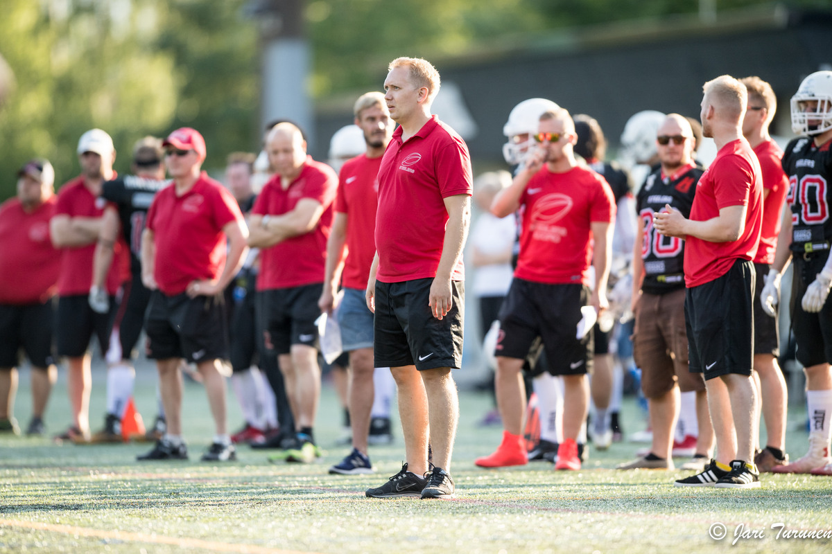 Mikä on paras ohje, jonka olet valmentajana saanut? Ja vastaavasti mikä on se punainen lanka, josta punot omia harjoituksiasi ja omaa valmennustasi?Punainen lanka on ehdottomasti perustaitojen korostaminen. Liikkuminen laajasti ja laaja-alaisesti, pallon kiinniottaminen, kaikki yksinkertaiset asiat. Niitä me tehdään varmasti paljon verrattuna muihin ja tullaan tekemään myös jatkossa. Vaarallisin asia meidän vastustajia ajatellen on se, että meidän nuoret urheilijat ei ole vielä oikeastaan muuta tehneetkään kuin perustaa. Pikku hiljaa siirrytään enemmän ja enemmän kohti ”perinteistä” jefu-valmennusta, eli pelin taktisiin ja teknisiin yksityiskohtiin. Minulla on aika hyvä muisti ja tulen muistamaan ikuisesti sen hetken muutama vuosi takaperin, kun Urheiluruudussa korin alla palloa palauttamassa seisoi Henrik Dettmann. Susijengi oli valmistautumassa kai EM-kisoihin ja mitä teki päävalmentaja? Seisoi korin alla, kun jokainen huippupelaaja kävi vuorollaan heittämässä 500 vapaaheittoa päävalmentajan korjatessa tekniikkaa tarpeen vaatiessa vaikka jokaisen heiton välissä. Vahva luotto omaan perustekniikkaan on parasta psyykkistä valmennusta. Niin ja paras ohje on selkeästi Speedy Nissiseltä: Se on futista, ei auta rutista. Mitä sinä valmentajana odotat pelaajalta?Helpoin kysymys tähän mennessä! Odotan sitoutumista. Mikäli pelaaja sitoutuu, tarkoittaa se sitä että sekä minulla että hänellä on yhteinen tavoite ja päämäärä. Sattuu matkalla mitä tahansa mutkia tai ristiriitoja, mutta yhteinen päämäärä takaa lähes aina sen, että homma toimii. Ilman sitoutumista ei ole oikeaa pelaaja-valmentaja suhdetta, ilman sitoutuneita pelaajia ei ole oikeaa joukkuetta, vain ryhmä satunnaisia yksilöitä. Minä en ole pyytänyt enkä vaadi "helposti valmennettavia" pelaajia, mutta sitoutuneita kyllä. Ja siinä olen todella onnekas, että tämä nykyryhmä on poikkeuksellisen sitoutunut kasa yksilöitä. Onko joukkueen jäsenen oltava enemmän urheilija kuin pelaaja?Korjaus edelliseen, tämä on vielä helpompi. Urheilija pystyy oppimaan mitä vaan, pelaaja-sana haiskahtaa jonkinlaiseen omien fyysisten kykyjen riittämättömyyden peittelemiseen jollain maagisella ”pelisilmällä” tai vastaavalla. Meidän kaikki harjoittelu, paljolti myös pelikaudella, pohjautuu pelaajien fysiikan parantamiseen. Kärjistetysti amerikkalainen jalkapallo on fyysinen peli, jossa isompi voittaa pienemmän ja nopea hitaamman. Valmensit Kuopio Steelersin I-divisioonan voittoon kaudella 2017. Vuotta aiemmin teitte Steelersissä selvän päätöksen: jätitte vahvistukset hankkimatta ja panostitte kotimaisten pelaajien kehittämiseen. Mitkä olivat tuolloin tärkeimpiä asioita, joihin panostitte?2016 kaudella me oltiin vielä niin nuoria ja kokemattomia, myös päävalmentaja mukaan lukien. Ehkä paras yksittäinen päätös mitä ollaan tässä projektin aikana tehty, oli se että satsattiin silloin seuran kehittämiseen, erityisesti seuran markkinointiin. Tehtiin meidän mittapuulla aika isojakin satsauksia erilaisiin seuran ulkoista näkyvyyttä parantaviin juttuihin, varsinkin sosiaalisen median puolella mutta myös muualla. Loistavan Kotiottelutiimin kasaaminen, treenivarusteiden parantaminen ja kaikkea muuta pientä saatiin silloin tehtyä, kun maltettiin jättää importit kotiinsa. Pelillisesti oli iso juttu tavallaan pakottaa omat nuoret pelaajat isoihin rooleihin, tavallaan pakottaa heidät kantamaan vastuuta. Ei ollut jenkkipelaajia, jotka olisivat pystyneet tarpeen vaatiessa kääntämään pelejä, vaan meidän jokainen voitto sinä kesänä perustui joka ikisen kaksinkamppailun voittamiseen. Se mentaliteetti kantaa meitä vieläkin, toivottavasti vielä pitkään.