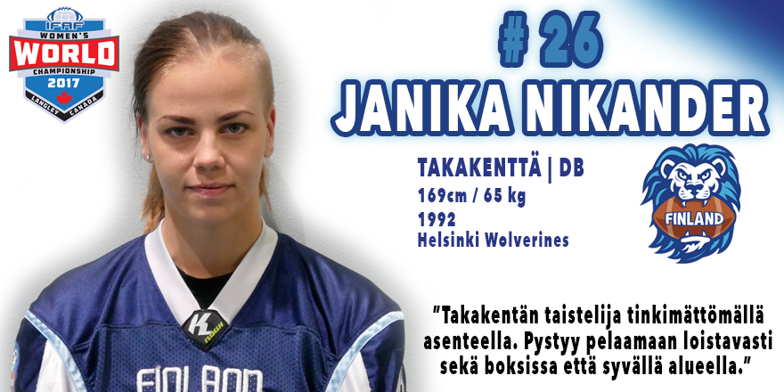 Sinulla on vankka kamppailu-urheilutausta. Kerro siitä vähän tarkemmin.Ennen jenkkifutiksen aloittamista harrastin tosissaan noin 10 vuotta karatea, joss kilpailin aktiivisesti maajoukkuetasolla vuoteen 2012 asti. Tarkemmista saavutuksista en ole pitänyt kirjaa sen kummemmin, mutta kisaurasta tarttui mukaan muutama SM-mitali ja PM-pronssi vuodelta 2010, jos en ihan väärin muista. Vielä vuonna 2014 kävin suorittamassa 2. danin mustan vyön arvon, ja sen jälkeen muuttui harjoitteluni painottumaan lähestulkoon pelkästään amerikkalaiseen jalkapalloon. Myös jenkkifutista voi pitää kamppailu- ja taistelulajina. Koetko pelaajana kentällä olevasi pallopelin kentän sijasta taistelulajin tatamilla vai miten suhtaudut pelissä oleviin kaksintaisteluihin?Syy siihen, miksi lopulta pelipaikka valikoitui puolustuksen puolelle perustaa juurensa varmaankin juuri siihen, että kampailulajitaustan ansiosta kontakti ja itsensä ”psyykkaaminen” sopivaan taistelumoodiin tuli luonnostaan. Se, mikä jefussa kiehtoo, on juurikin se, että kyseessä on joukkuelaji, mutta pelien match upit eli kaksintaistelut tuovat aina sen oman lisänsä, mihin entisenä ”yksilölajin” harrastajana ei voi olla syttymättä - puolustuksessa pääsee rähisemään sopivasti. Kuka Wolverinesissa on kaksintaisteluiden "päällikkö", joka psyykkaa esimerkillään muutkin taistelemaan periksi antamatta viimeiseen asti?Kyllä aikamoinen päällikkö on meidän konkari Elina Seppälä, joka ei anna kenenkään edes ajatella periksi antamista oli tilanne kentällä mikä tahansa. Samaten pakko mainita viime kaudella meidän laivastonsinisissä pelannut taisteluhobitti Mia Rohkimainen, joka sai omalla olemuksellaan tehtyä monesti kovat psyykkaukset ainakin omaan tahtotilaani. Kooltaan ehkä pieni pelaaja, mutta taistelutahdoltaan yksi suurimmista. Entä kuka muiden joukkueiden pelaajista on jäänyt mieleesi kovana taistelijana?Oulun Anna-Reetta ”Are” Juntunen. Rehti ja pirun kova vääntäjä kummallakin puolella palloa - aina yhtä haastava mutta rehti vastus. Palataan siihen hetkeen, jolloin löysit jenkkifutiksen. Miten tämä tapahtui ja mikä oli se asia, joka sinut lajissa lumosi?Päädyin lajiin aikalailla sattumusten kautta. Kilpaileminen karatessa jäi taka-alalle, kun astuin armeijan vihreisiin hetkeksi palvelukseen ja siellä tutustuin edelleen kenttien taisteluparinani olevaan Emmi Järniin. Haluttiin sitten myöhemmin löytää yhteinen uusi harrastus, mitä voisi harrastaa sekä pitkä että lyhyt ihminen ja missä saisi käyttää kontaktia sekä (Emmin) hyviä pallokäsiä. Sitten saatiinkin kutsu samoihin aikoihin Wolvojen naisten ensimmäisiin try outteihin ja kun kaikki vaatimukset lajin suhteen täyttyi, niin sillä tiellä edelleen ollaan. Onko se vieläkin se asia, joka tekee jefusta sinulle rakkaan lajin?Monipuolisuus on se, mikä on edelleen tärkein. Tässä lajissa vaan tuppaa aina olemaan jotain opittavaa, vaikka kuinka treenaa ja opiskelee. Mikä jefusta tekee tärkeän lajin, on tiiviydellään itseni yllättänyt ''jefuperhe''. En ole lajia edes erityisen pitkään kerennyt harrastelemaan, mutta ihmisistä jefun parissa on tullut ystäviä ja läheisiä varmasti loppuiäksi. Olet pelannut jenkkifutista myös maajoukkueessa ja olit Suomen 100-vuotisjuhlavuonna Kanadassa pelaamassa MM-kisoissa. Miten tärkeää itsellesi on edustaa kotimaatasi? Voiko sitä verrata seurajoukkueen värien puolesta pelaamiseen?Sinivalkoisten peliasujen päälle pukeminen on kunnia asia ja Suomessa saa tehdä älyttömän kovaa työtä sen eteen, että paikan joukkueesta saa. Se eroaa seurajoukkueessa pelaamisesta siinä, miten normaalisti toisiaan vastaan pelaavat ihmiset unohtavat kotimaan sarjojen vastakkainasettelut ja löytävät yhteisen tavoitteen näyttää maailmalle, miten sinivalkoinen leijona taistelee. Kumpikin joukkue on oma joukkue ja tavoitteena voittaa yhdessä. Seurajoukkueen kanssa sen tavoitteen eteen tehdään töitä yhdessä sen sijaan ympäri vuoden, joten joukkueen kehitystä pääsee seuraamaan alusta alkaen, mikä tuo pelaamiseen oman lisänsä ja jopa ”tunteikkuutensa”. Same thing but different. Tuleva kausi lähestyy vääjäämättä hetki hetkeltä. Mihin asioihin olet keskittynyt harjoittelussasi? Mitä tavoitteita itselläsi on tulevalle kaudelle ja miten Wolverines uusii Suomen mestaruutensa kauden päätteeksi?Rehellinen ihminen kuin olen, niin vastaan tänä vuonna olen vielä tähän mennessä mennyt opiskelujen armoilla. Viime kausi oli aikamoinen rutistus niin fyysisesti kuin henkisestikin, joten harjoittelu tähän mennessä on keskittynyt omaan oheisharjoitteluun. Wolverinesiin ollaan tänäkin vuonna saatu älyttömästi uusia pelaajia – niin rookieita kuin kokeneimpiakin vierailijoita, mikä on pitänyt pelaajamäärät treeneissä korkealla. Wolverines uusii Suomen mestaruutensa luottamalla omaan tekemiseensä, jossa tavoitteita ei aseteta vain yhtä kautta varten, vaan toiminta ja tavoitteet on asetettu pidemmälle tähtäimelle. Tänä vuonna ollaan käynnistämässä aktiivisesti naisten U19- ja tyttöjen U17-sarjatoimintaa. Miten kannustaisit seuroja, vanhempia ja uusia kokeilijoita itseään lähtemään mukaan tähän lajiin?Tyttöjen saaminen mukaan lajiin vaatii omasta mielestäni uuden näkökulman tuomista mukaan toiminnan mainostukseen ja lajitietouden lisäämiseen. Aktiivinen lajin esittely, tytöille suunnattujen kokeilukertojen ja toiminnan suuntaaminen esimerkiksi kouluihin on mielestäni hyvä tapa aloittaa, mikä onkin näkynyt jo muutaman joukkueen toiminnassa tänäkin vuonna. Aktiivinen jatkuva toiminta asian eteen on avainasemassa ja toivottavasti Suomessakin nähdään lähivuosina tyttöjen sarjatoimintaa. Sunnuntain ja maanantain välisenä yönä pelataan Super Bowl. Sinut tunnetaan kovana hallitsevan mestarin Patriotsin kannattajana. Miksi Patriots voittaa Super Bowlin ja kuka on ottelun arvokkain pelaaja?Koska Belichick j