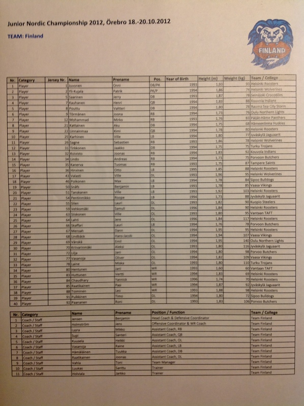 Tanska vei voiton jatkoajalla. Jensen: "Olemme tyytyväisiä peliin molemmin puolin palloa." Suomen U19-maajoukkue kärsi niukan tappion PM-avauksessaan Ruotsin Örebrossa. Tanska oli hyökkäyskilpailun jälkeen parempi 32-26. Suomen voitto oli erittäin lähellä viimeistä edellisen hyökkäysvuoron päätteeksi Suomen lisäpistepotku epäonnistui tilanteessa 26-26. Sen jälkeen Suomi pääsi vain viiden jaardin päähän maalista seuraavalla vuorollaan, kun taas Tanska onnistui tekemään touchdownin. Päävalmentaja BJ Jensen oli ottelun jälkeen pettynyt. - Hyökkäyksemme pelasi hyvin ja paransi valtavasti viime vuodesta. Mutta meillä ei ollut aikaa paneutua potkupeleihin tarpeeksi, ja se satutti meitä. Se on minun syyni, koska olen vastussa erikoisjoukkueista. Puolustukselta OK peli. Teimme paljon muutoksia ottelun aikana, ja se saattoi sekoittaa joidenkin pelaajien peliä. Kaiken kaikkiaan olemme tyytyväisiä peliimme molemmin puolin palloa. Pelinrakentaja Kimi Linnainmaa heitti ottelussa 39 kertaa, ja onnistui 16 kertaa. Hän heitti kaksi touchdownia ja kaksi syötönkatkoa sekä 166 jaardia. Suomen touchdowneista vastasivat juosten Sebastien Sagne ja Joona Törmänen ja kiinniotoilla Yannick Chaudhary sekä Pasi Raatikainen. Puolustuksessa eniten taklauksia (5) keräsivät Ville Karhinen ja Onni Juvonen. Ottelun tilastot: http://www.laget.se/BLACKKNIGHTS/Document/Download/336578/3102722 Suomen kisat jatkuvat lauantaina kello 13.30 Suomen aikaa, kun vastassa on Ruotsi. Torstain avausottelussa Ruotsi kaatoi Tanskan 40-20. Huomisen ottelun näet suorana lähetyksenä osoitteessa http://www.orebroguiden.com/guidentv/