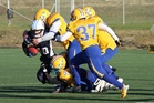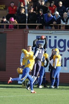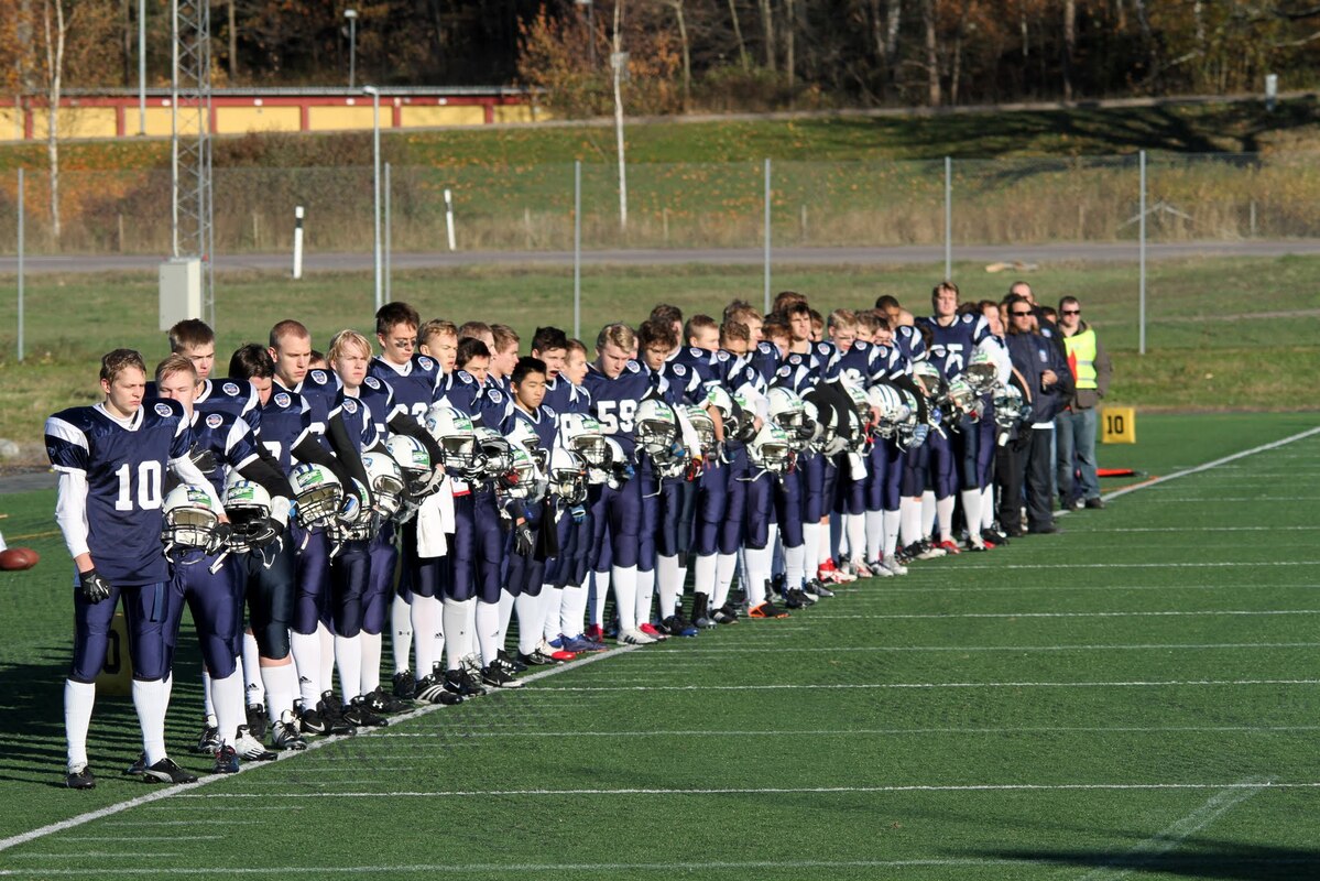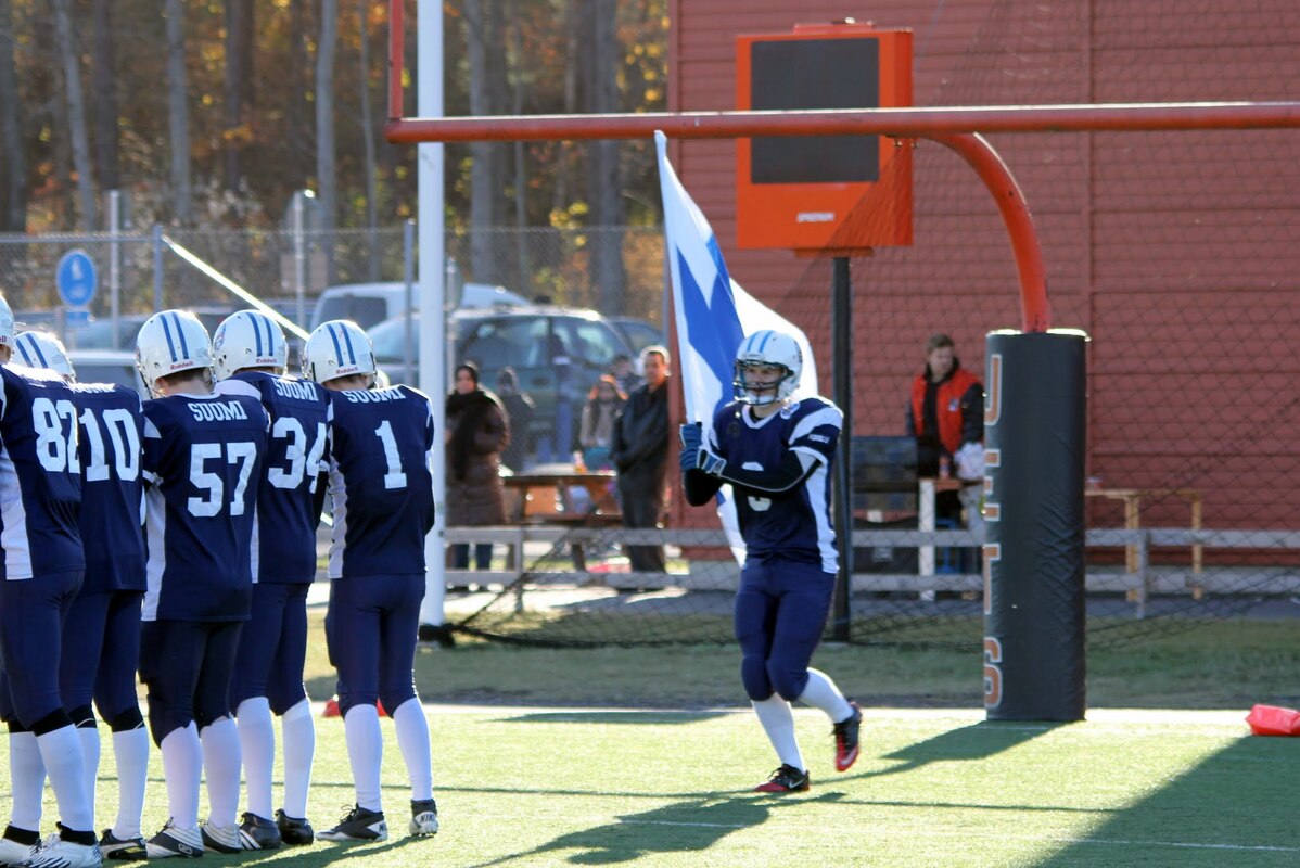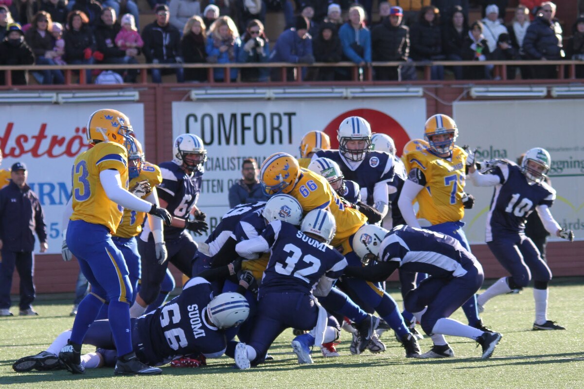 Suomen U17 maajoukkue voitti Ruotsin 7-13 (0-6) Märstassa pelatussa ottelussa. Suomen maalisuorituksista vastasivat tamperelaiset Tuukka Lehtonen ja Kimmo Jokinen, jotka juoksivat molemmat maalit. Aurinkoisen viileässä säässä pelatussa maaottelussa Suomi oli kuskin paikalla lähes koko ottelun. Ensimmäisellä puoliskolla pallo pomppi suomalaishyökkääjien käsissä ja pallonmenetyksiä tapahtui luvattoman paljon. Ote siirtyi kuitenkin Suomelle ja pelinrakentaja Otto Konola onnistui heittämään kaksi peräkkäistä pitkää heittoa, ensin 25 jaardia Kalle Kilickesenille ja 22-jaardia Paavo Väänäselle. Keskushyökkääjä Tuukka Lehtonen väänsi hyvästä kenttäasemasta kolmen jaardin juoksumaalin, joka jäi samalla ensimmäisen puoliajan ainoiksi pisteiksi 0-6. Lisäpistepeli meni pieleen miehistövaihdon vuoksi. Suomen tasapainoinen hyökkäys juoksi ja heitti läpi ottelun. Hyökkäyslinja toimi hyvin ja sai hyvän pelirytmin Ruotsin aggressiivista blitziin perustunutta puolustusta vastaan. Hyökkäyslinjassa miehiä kierrätettiin aktiivisesti. Suomi hallitsi kenttäasemia läpi ottelun. Suomen toisen maalin juoksi 4:llä neljänneksellä Kimmo Jokinen. Päivän hienoimmassa suorituksessa Jokinen pyrähti 54 jaardia trap-pelin päätteeksi. Suomi johti ottelua 0-13, kun Jaakko Koivunen potkaisi lisäpisteen sisään onnistuneesti. Suomalaishyökkääjistä pelinrakentaja Otto Konola heitti 3 onnistunutta heittoa 11 yrityksellä. Näillä tuli etenemistä 60 jaardia ja yksi syötönkatko lisättiin hänen sarakkeeseensa. Juoksupeli kulki hyvin ja ottelun work horse Tuukka ”Veikan pikkuveli” Lehtonen kantoi 15 yrityksellä 82 jaardia. Fullback Kimmo Jokinen eteni 65 jaardia viidellä pallonkantokerralla. Keskushyökkääjä Mai Tri Thach lisäsi suomalaisten juoksusaldoon 29 jaardia viidellä yrityksellä. Suomen puolustus pelasi varmasti ja piti Ruotsin poissa maalintekoalueelta. Puolustuksen pelaaminen oli kollektiivinen rytistys, sillä peräti 17 pelaaja keräsi tilastomerkinnän puolustussarakkeeseen. Kaikki yhdeksän linjapuolustajaa piti vauhtia yllä läpi ottelun ja mm. Jaakko Aroheinä onnistui säkittämään kahdesti ruotsalaispelinrakentajan. Tukimies Jaska Väriselle merkittiin yksi 10 jaardia miinukselle päätynyt säkitys. Puolustustuksen hienon päivän kruunasi Peik Lehtisen, Samuli Vehkomäen, Juhani Jurvakaisen ja Ville Rajalaisen taklaukset linjan takana. Akseli Arvaja taklasi ruotsalaisia kolmen soolon verran ja Jaska Värinen levittäytyi jokapuolelle suorittaen 5,5 taklausta. Suomalaispuolustuksesta Saintsin Benjamin Ylipää otti yhden syötönkatkon. Päävalmentaja Tero Virtanen: - Suomi teki niitä asioita, joita osasi. Ruotsilla oli jälleen isokokoinen ja fyysinen joukkue, mutta tällä kertaa Suomi voitti keskittymällä perusfutiksen pelaamiseen. Suomi on edellisen kerran voittanut Ruotsin vuonna 2008, kun ikäryhmän maaottelusarja aloitettiin. Ottelun palkinnot: Game MVP Aleksi Arvaja |
