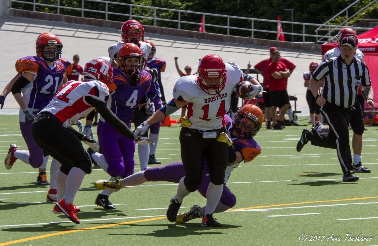 Valkyries – Roosters 24–26 (12–12)Velodromin lauantai-illassa nähtiin kaikin puolin erittäin mielenkiintoinen ja tilastojenkin valossa hyvin tasainen kamppailu. Eron teki ottelun ainoassa lisäpistepelissä onnistunut Mari Jääskelä. Tasatahtia edenneessä välienselvittelyssä, kumpikin joukkue pyrki pelaamaan jokaisen neljästä lisäpisteyrityksestään kahden pisteen arvoisesti, mutta yritykset pysähtyivät, Jääskelän maalia lukuun ottamatta, kerta toisensa jälkeen vastustajan tiiviiseen puolustukseen. Pietarilaisten ja edelliskierroksen arvokkaimmaksi pelaajaksi valittu Daria Briukhovetskaya viimeisteli joukkueensa jokaisen maalin. Neljä touchdownia ja liki 190 jaardia hyökkäyksessä kerännyt keskushyökkääjä piti kukkopuolustuksen jatkuvasti varpaillaan. Mukaan mahtui yksi oman maalialueen tuntumasta lähtenyt rynnistys, jolle mittaa kertyi 86 jaardia. – Puolustuksessa oltiin ongelmissa vastustajan kiertopelien kurissa pitämisessä. Briukhovetskayan nopeus yllätti meidät taas kerran, kommentoi Roostersin päävalmentaja Heli Harjanne. Roosters-hyökkäys keräsi onnistumisia lauantaina laajalla rintamalla. Maalit pelinrakentaja Janina Virtaselle ja pelin ratkaisseelle Mari Jääskelälle sekä kahdesti toisella puoliajalla maalanneelle Katri Ronnille. Juoksuhyökkäykseensä luottaneen Roostersin kaikki 308 jaardia tulivat juoksupelin kautta. Vieraiden hyökkäystyöskentely miellytti myös päävalmentaja Harjannetta. – Hyökkäyksellämme oli lauantaina hyvä ote peliin. Driveja saatiin vietyä määrätietoisesti päätyyn saakka. Kovaa peliin tulleet valkyyrit olivat puolustuksessa fyysisesti todella vahvoja. Taklaustilaston nimiinsä vei tukimieskerroksen Natalia Voroshilova 8.5 pommilla. Tulitukea tarjoili linjan Julia Bobrova (7.5 taklausta), joka pysäytti etenemiset kolmesti aloituslinjan, Roostersin näkökulmasta, väärällä puolella. Kukkojen korkeimman taklausmäärän tilastoi linjan Hilkka Rahkonen (5.5 taklausta). Pisteet: Valkyries: Daria Briukhovetskaya 24 Roosters: Katri Ronni 12, Mari Jääskelä 8, Janina Virtanen 6