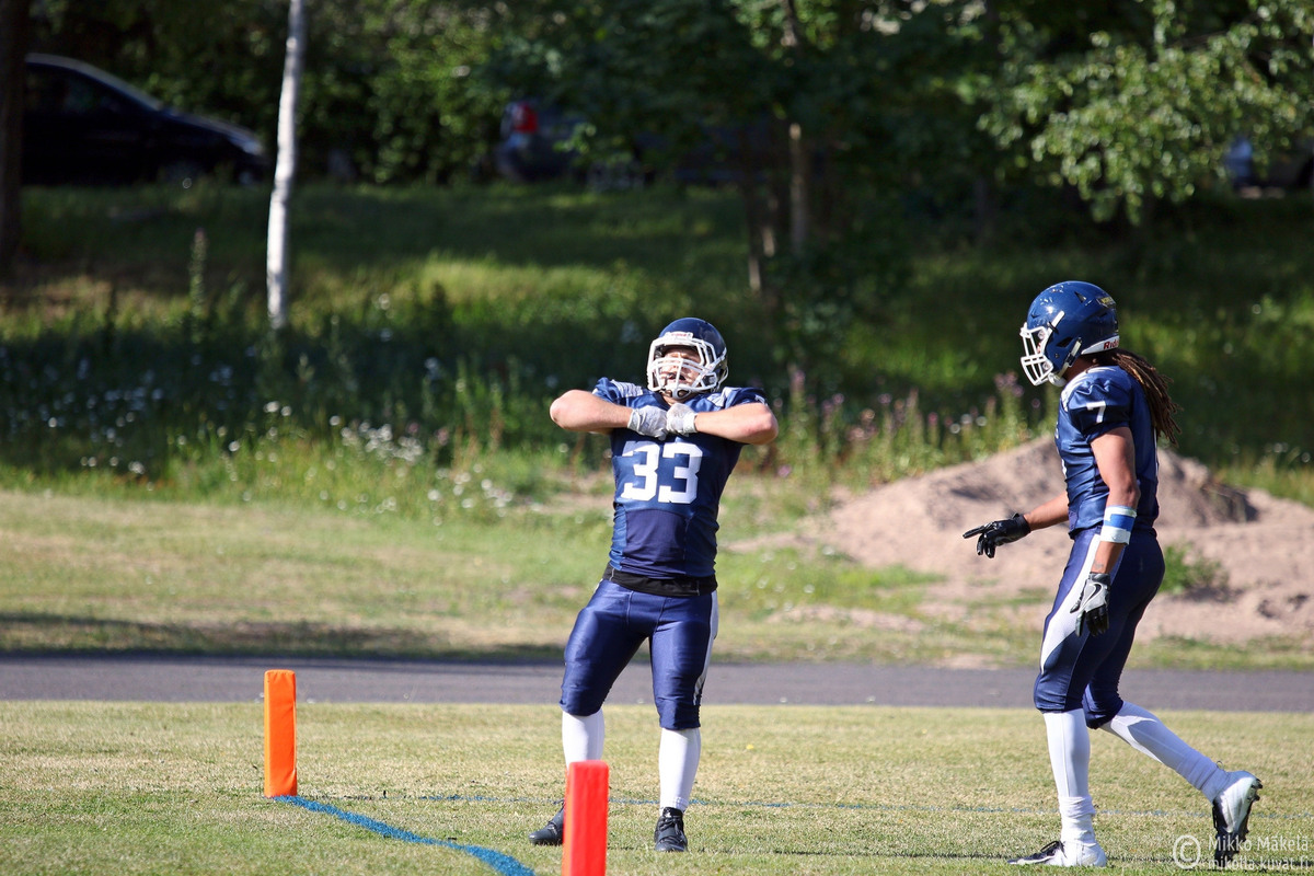 Väkevästi läpi ottelun esiintyneet kotkalaiset vankistivat Miesten I-divisioonan toista sijaansa. Eagles – East City Giants 31–19 (18–3)Miesten I-divisioonan viides ottelukierros potkaistiin käyntiin lauantaina Kotkassa. Puistolan kentällä käydyssä Eaglesin ja ECG:n välisessä kamppailussa isännät nappasivat makean voiton helsinkiläisvieraistaan ja kasvattivat kauden voittosaldonsa kolmeen. Ottelun avauspuolikkaalla kotijoukkue hallitsi pelin kulkua. Kotkien hyökkäys onnistui maalinteossa kolmesti, mutta lisäpisteet eivät hyvästä yrityksestä huolimatta uponneet. Eaglesin maalintekijöinä kunnostautuivat, ottelun avausmaalista vastannut, laitahyökkääjä Munchie Roberts kahdesti ja Ottopekka Leskinen kertaalleen. Kaikki isäntien maalit avauspuolikkaalla pohjustanut pelinrakentaja Niclas Carpelan heitti ottelussa 208 jaardia, onnistumisprosentin ollessa päälle kuudenkymmenen. Vieraiden ainokaisesta pistesuorituksesta vastasi 27 jaardin kenttäpotkun haarukkaan toimittanut Joni Aurala. Puoliajalle siirryttiin kotkalaiskomennossa 18–3. Toisella puoliskolla Eagles jatkoi väkevää suorittamistaan ja kasvatti johtoaan kahdella touchdownilla. Pisteet kamppailun kolmannen maalinsa kirjanneelle Robertsille ja loistavasti ottelussa palloa kantaneelle keskushyökkääjä Ville Hämäläiselle. Hämäläisen 74 jaardisen maalin kruunasi lisäpistepotkullaan Jani Heinisalo – tässä vaiheessa jo ottelu ratkaisevan tuntuisesti 31–3 kotijoukkueelle. Jättiläiset eivät kuitenkaan lyöneet hanskoja tiskiin ja yritys palkittiin lopulta viimeisellä neljänneksellä. Eagles-puolustuksen pihdeissä tähän saakka hyvin pysynyt ECG-pelinrakentaja Jabari Harris rupesi löytämään heitolleen rytmiä ja aukkoja kotkalaisten puolustuksesta. Pelinrakentaja pohjustikin kaksi seuraavaa Robin Drockilan touchdownia ja tilastoi omiin nimiinsä neljä lisäpistettä. Peliaika kului umpeen eikä enempää maaleja kamppailussa enää nähty, joten 232 jaardia ottelussa heittänyt Harris joutui suojatteineen kotimatkalle ilman pisteitä. Loppulukemat Puistolan kentällä 31–19. Giantsin hyökkäyksen lähes tyystin pysäyttänyt Eagles-puolustus ansaitsee ottelusta suuret kehut, kun se kykeni pitämään jättiläisten juoksuhyökkäyksen pimennossa läpi ottelun. Harrisin totutut omat juoksut jäivät poikkeuksetta lyhyiksi. Kotijoukkueen taklaustilaston nimiinsä kirjasivat Ari Riihiluoma ja Patrik Thesleff – kumpaisellekin 5.5 osumaa. Kotkien takakentän Mika Kulmalalle kirjattiin kaksi pallon maahanlyöntiä ja 4.5 taklausta. Vieraiden ykkösnimi puolustuksessa oli väkivahva britti James Perrineau 6.5 pommilla.