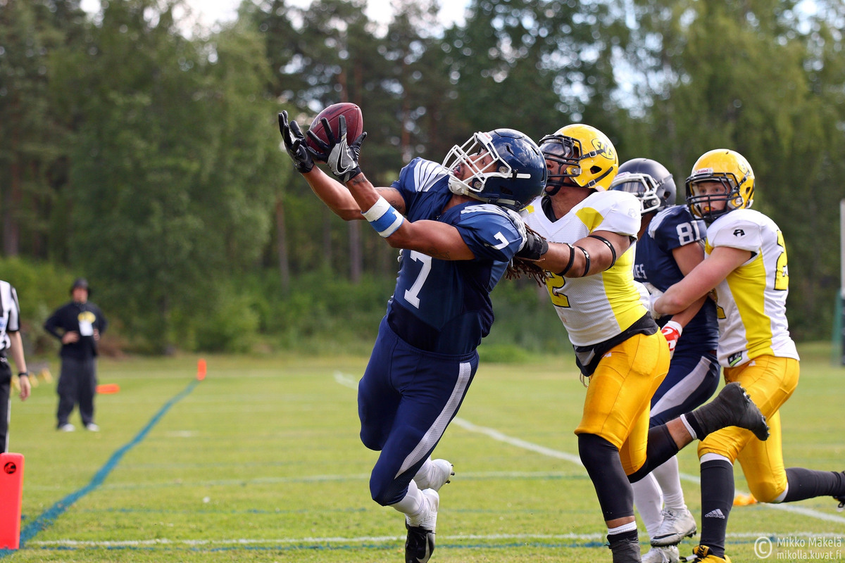 Viidennen pelikierroksen arvokkaimman pelaajan valintaan oli tyrkyllä useampi peleissään loistanut pelaaja. Helsinki Wolverinesin Robert Johnson on valittu toista kertaa tällä kaudella Miesten I-divisioonan viikon arvokkaimmaksi pelaajaksi. Myös neljännen pelikierroksen MVP:ksi valittu Johnson oli maanantai-iltana huimassa vedossa, kun Wolverines nappasi kauden neljännen voittonsa United Newland Crusadersista lukemin 49–34. Pelinrakentaja alusti joukkueensa jokaisen seitsemästä touchdownista heitoillaan – heittojaardilukema huikea 545 ja onnistumisprosentti päälle 80. Yhdysvaltalaispelinrakentaja on tämän kauden neljässä ottelussa pohjustanut 24 maalia heitoillaan. Kierroksen arvokkaimmaksi pelaajaksi olivat vahvasti tyrkyllä Johnson veli, Cedric, joka onnistui maanantaina maalinteossa neljästi sekä Kotka Eaglesin voittoon ECG:sta johdattanut Munchie Roberts, joka onnistui iskemään kolme maalia. |