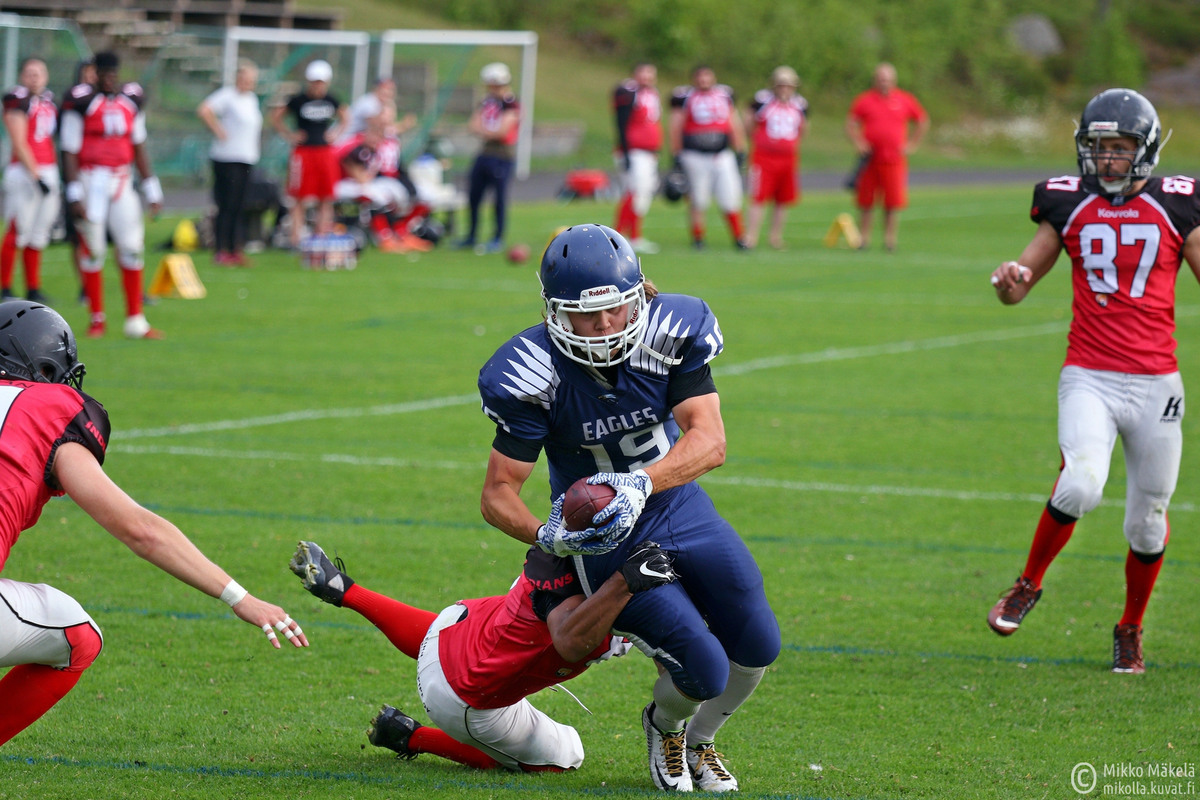Kotka Eaglesin laitahyökkääjä oli kierroksen pisteahnein pelaaja. Jani Heinisalo on valittu Miesten I-divisioonan kuudennen peliviikon arvokkaimmaksi pelaajaksi. Laitahyökkääjä oli hyvässä vedossa, kun Eagles kaatoi kotikentällään lauantaina Kouvola Indiansin lukemin 47–7. Voitolla kotkat venyttivät oman voittoputkensa jo kolmen ottelun mittaiseksi. Kotkalaisten voiton takuuna Puistolan kentällä oli väkevä toinen neljännes, jonka aikana kouvolalaiset tippuivat kyydistä pois. Heinisalo kirjasi kyseisessä ottelussa nimiinsä 17 pistettä, mikä oli myös koko kierroksen korkein lukema. Hyvistä kenttäasemista hyökkäämään läpi ottelun päässyt Eagles oli kliininen saadessaan pallonhallinnan: yhdestätoista draivista seitsemän päättyi touchdowniin. Kotkalaisten numero 19 tehot muodostuivat kahdesta touchdownista ja viidestä lisäpistepotkusta haarukkaan. Heiton ykköskohteena ollut Heinisalo sai nauttia pelinrakentaja Niclas Carpelan loistoalustuksista – jaardikeskiarvon ollessa lähes seitsemän. |