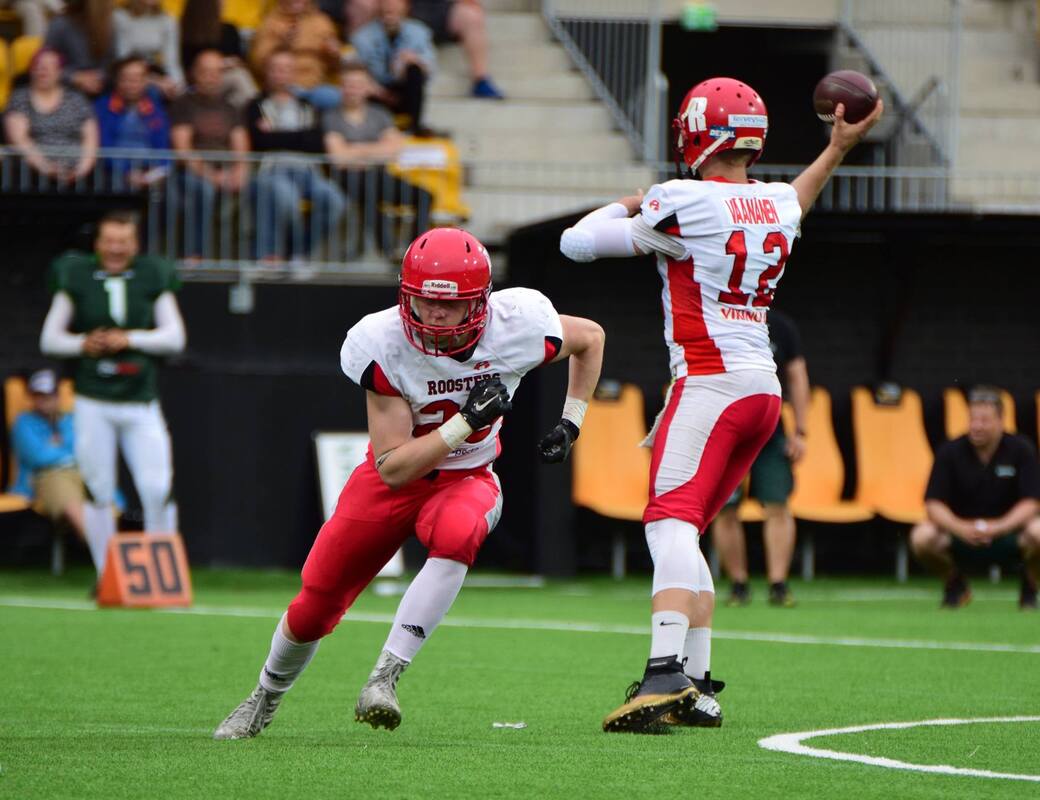 Henri Väänäsen kausi Bitters Leaguessa oli herran omien sanojen mukaan värikäs monella tapaa. Tšekin Bitters Leaguen finaali pelataan tulevana lauantaina, kun loppuottelussa kohtaavat toista kertaa peräkkäin Praha Black Panthers ja Ostrava Steelers. Bitters League on jo pitkään kulkenut Tšekin pääkaupungin, Prahan, joukkueiden komennossa. Hallitseva mestari Praha Black Panthers on voittanut 2000-luvulla mestaruuden 13 kertaa. Talvella uutisoitiin Henri Väänäsen siirrosta Steelersin riveihin – kausi ei kuitenkaan mennyt pelinrakentajan suunnitelmien mukaan. Lupaava alkuHelsinki Roostersia edelliskaudella edustaneen Väänäsen uutisoitiin siirtyvän tammikuussa Tšekin liigan hopeajoukkue Ostrava Steelersin riveihin, joka oli ollut pelinrakentajasta kiinnostunut jo vuotta aikaisemmin. Päävalmentaja Garreth Griffethin kanssa käytyjen keskustelujen jälkeen Steelers sai vakuutettua Väänäsen ja sopimus allekirjoitettiin. Väänäsen tarkoituksena oli pelata kevät ja alkukesä Tsekissä, jonka jälkeen hänen piti palata sovitusti Roostersin Vaahteraliiga-joukkueen vahvuuteen. Väänänen saapui sovitusti Ostravaan tammikuussa ja aloitti harjoittelun Steelersin mukana, kuten oltiin suunniteltu. Kolme kuukautta menivät hyvin: pelikirja ja kemiat klikkasivat uuden joukkueen kanssa. Steelersin kausi starttasi huhtikuun 8. päivä, jossa vieraskentällä kaatui tiukkojen vaiheiden jälkeen Pardubice Stallions 20–21. Väänänen oli ottelussa isossa roolissa, alustaen heitoillaan kaksi touchdownia – voitto-osumaksi jäänyt maali syntyi, kun pelikellossa oli jäljellä enää kaksi minuuttia. Seuraavalla viikolla oli vuorossa taisto sarjan suurimpiin kuuluvaa Prague Lionsia vastaan. Kotijoukkue Steelers hävisi tuon kyseisen ottelun selvin numeroin, mutta Väänänen ei tuota kamppailu pystynyt pelaamaan loppuun. – Sain ottelussa niskavamman ja jouduin sairaalaan tarkkailtavaksi, kertaa Väänänen. Sopimuksen irtisanominen tuli yllätyksenä VäänäselleKolmannella peliviikolla pelinrakentajaa ei joukkueen mukana nähty, kun Steelers kohtasi Brno Sigrsin. Steelersin leiriin satoi tuossa ottelussa lisää huonoja uutisia, kun yhdysvaltalaisvahvistus ja Väänäsen hyvä ystävä Luke Wildung sai yhden ottelun pelikiellon. Sarjan touchdown-tilastoa johtaneen Wildungin ja pelinrakentaja Väänäsen poissaolot olivat liian iso menetys Steelersille, joka koki rökäletappion neljännen kierroksen ottelussa Black Panthereita vastaan. Tässä vaiheessa koko pakka meni sekaisin. – Saimme Luken kanssa kuulla välikäden kautta, että meidän sopimuksemme on purettu ja tilalle oli tuotu uusi yhdysvaltalaisvahvistus, kertoo Väänänen. Ostrava Steelers käytti pelaajien neljännen kierroksen poissaoloa syynä sopimusten purkamiselle. Joukkueen päävalmentaja oli käynyt palaverin yhdessä joukkueen managerin ja kapteenin kanssa siitä, että pelaajien sopimukset irtisanottaisiin. Selitykset potkuille ihmetyttävät Väänästä edelleen. – Seura kertoi minulle, että lääkäristä oli heille kantautunut tieto, etten kykenisi pelaamaan kuukauteen. Menin tämän jälkeen lääkäriin, joka totesi, ettei lihasvamma niskassa estäisi pelaamistani, jos itsestäni tuntuu hyvältä. Steelersin tavoitteena oli, mitä luultavammin saada kauden alusta saakka itselleen amerikkalaispelinrakentaja, mutta seuran hyökkäystä koordinoiva Wildungin halusi nimenomaan Väänäsen. Loukkaantumiset olivat vain ja ainoastaan tekosyitä päästä eroon Väänäsestä ja Wildungista. Päävalmentajan kanssa Väänänen ei ole puhunut tapahtuneen jälkeen. Suuntana BrnoPelaajilla oli edessään uuden seuran etsiminen, joka löytyi kummallekin Brnosta. Tšekin toiseksi suurin kaupunki Brno sijaitsi kolmen tunnin ajomatkan päässä Ostravasta, maan eteläosassa, johon ystävykset asettuivat loppukauden ajaksi kämppiksiksi. Wildung sai sopimuksen Brno Alligatorsiin, kun taas Väänäsen uudeksi seuraksi tuli Brno Sigrs. Sekä Alligators että Sigrs eivät joukkueina kuulu sarjan kärkipäähän ja tason pudotus oli myös Väänäselle alkuun shokki. – Sigrs oli sarjanousija eikä joukkueena siitäkään syystä yhtä laadukas, mitä Steelers oli. Alkuun oli kulttuurishokki hypätä yhtä talenttitasoa alemmas ja rytmin löytäminen oli haastavaa. Suurin ongelma oli pelaajien peliälyn ja talenttitason kanssa, mitä ei voi edes verrata Suomen Vaahteraliigatasoon. Väänänen jatkoi työn tekoa: uuden pelikirjan opettelu vei oman aikansa. Kaudesta muodostui kuitenkin lopulta värikäs ja vauhdikas niin kuin pelinrakentaja itse kauttaan kuvailee. Sigrs selviytyi viimeisen kierroksen voittonsa turvin pudotuspeleihin, jossa Black Panthers otti tyylipuhtaan 63–0 voiton brnolaisista. Kyseisessä pelissä Väänänen ei pelannut loukkaantumisen takia. Ostravalla on mahdollisuutensaKaikesta tapahtuneesta huolimatta Väänäsellä on värikkäästä Tšekin kaudesta paljon hyviä muistoja ja ystäviä. Asiat olisivat Ostravassa voineet sujua eri tavalla, mutta mies on kuitenkin tyytyväinen, että sai pelata Bitters Leaguessa koko kauden. Tulevan lauantain finaalista mies ennakoi tiukkaa. – Vaikka Black Panthers on ollut suvereeni tällä kaudella, uskon, että Steelersilla on kaikki mahdollisuudet napata heistä voitto. Ainoastaan kolme joukkuetta onnistui kymmenessä runkosarjan kamppailussa pisteiden tekoon Prahan panttereita vastaan. Joukkueen runko koostuu pitkälti tšekin maajoukkuepelaajistosta, höystettynä parilla täsmähankinnalla valtameren toiselta puolelta. Rahojaan Väänänen ei kuitenkaan laittaisi Steelersille. – Vaikka Steelersilla on hyvä runko kasassa, epäilen että Panthers vie finaalin nimiinsä kokemuksellaan. Paluu kotiinVäänänen on nyt ollut Suomessa ja Helsingissä vajaan viikon. Mies on hyvillä mielin paluusta ja vakuuttaa olevansa taas kunnossa tuleviin koitoksiin. Miehen kausi jatkuu, kuten aikaisemmin oli sovittu, Roostersin mukana, joka saa takuuvarmasti