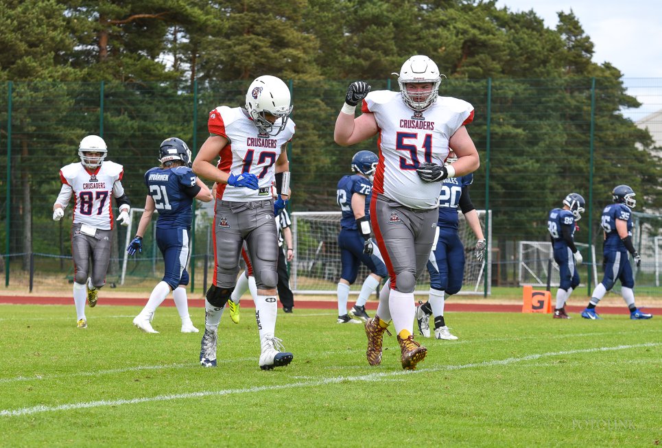 Ryan Tuiasoa johti kotijoukkueen juoksujuhlaa. Crusaders – Indians 62–37 (41–13)Miesten I-divisioona jatkui seitsemännen peliviikon osalta lauantaina yhden ottelun voimin. Helteisellä ja aurinkoisella Harjun kentällä nähtiin varsin maalirikas taisto, kun United Newland Crusaders isännöi, ensimmäistä kertaa tällä kaudella Lohjalla pelatussa ottelussa, Kouvola Indiansia. Kotijoukkue UNC oli tyly isäntä, ratkaisten kamppailun jo avauspuoliajalla ja syvensi kouvolalaisten ahdinkoa entisestään. Ristiretkeläisten marssia johti tuttu mies, Ryan Tuiasoa, joka viimeisteli neljä touchdownia ja kantoi palloa uskomattomat 383 jaardia. Ottelun avauspuoliajalla nähtiin peräti kahdeksan touchdownia, joista kuudesta vastasi kotijoukkue. UNC:n juoksu oli oivassa vireessä: Tuaisoa ja Tom Lastunen kantoivat palloa varsin mallikkaasti eikä intiaanipuolustus saanut heitä kuriin missään vaiheessa kuriin. Herrojen juoksukeskiarvot ottelussa olivat 16.6 ja 6.8 jaardia, joista hawaijilaiskeskushyökkääjän ensimmäiseksi mainittuna. Crusaders pääsi hyökkäämään hyvistä kenttäasemista ja oli omissa paikoissaan kliininen. UNC-puolustaja Ove Ekholm katkaisi kertaalleen Indiansin heiton syvällä vierailijoiden päädyssä ja kirmasi pallon kainalossaan maaliin. Indiansin maaleista avauspuolikkaalla vastasivat laitahyökkääjä Chris Winrow ja pelinrakentaja Ben Wilkerson. Avauspuoliaika päätökseen tilanteessa 41–13. Toinen puolikas oli ennen kaikkea tasainen ja kumpikin joukkue onnistui maalinteossa vuoron perään. Läpi ottelun syvältä omasta kenttäpäädystään hyökkäämään joutuneet kouvolalaiset pelasivat vapautuneemmin ja olivat rohkeampia hyökätessään. Intiaanit saivat vietyä omia pitkiä pallonhallintajaksojaan maaliin asti avauspuoliaikaa tehokkaampi ja oli huolellisempi pallon kanssa. Vierailijoiden tehokkain oli pelinrakentaja Wilkerson, joka väläytteli jälleen omilla juoksuillaan ja viimeisteli neljä intiaanien touchdowneista jalan. UNC:n Alvaro Guitianin jalka oli hyvässä vireessä, kun avauspotkujen keskiarvo oli päälle 56 jaardin – lisäksi lisäpistepotkuista jokainen (6) onnistui ja yhteensä mies kerrytti isäntien kokonaissaldoa 18 pisteellä. Pisteet:Crusaders: Ryan Tuiasoa 24, Alvaro Guitian 18, Ove Ekholm 6, Noam Calvache 6, Tom Lastunen 6, Teemu Lintunen 2 Indians: Ben Wilkerson 24, Chris Winrow 6, Chris Hall 6, Granit Uka 1