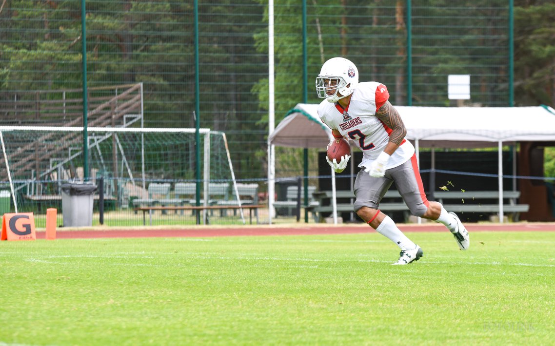United Newland Crusadersin keskushyökkääjä johti lauantaina joukkueensa juoksukarusellia. Miesten I-divisioonan seitsemännen peliviikon arvokkaimmaksi pelaajaksi on valittu Ryan Tuaisoa. Hawaijilta keväällä Suomeen saapunut keskushyökkääjä oli oivassa vireessä, kun miehen edustama Crusaders tyylitteli kauden toiseen voittoonsa viikonloppuna Indiansia vastaan. MVP-titteli oli Tuiasoalle tämän kauden toinen. Helteisellä Harjun kentällä Tuiasoa oli pitelemätön eikä miestä tuntunut saavaan millään kuriin. 23 pallonkantoyrityksellään matkaa kertyi lähes neljäsataa jaardia – juoksukeskiarvo 16.6! Komeat lukemat ovat tämän kauden suurimmat keskushyökkääjän tilastoimat. Juoksuhyökkäykseensä luottaneiden ristiretkeläisten yhdeksästä maalista Tuiasoa viimeisteli neljä. Yhdysvaltalaisen kokonaismaalimäärä näyttää nyt 13, viiden pelatun pelin jälkeen. Tuaisoa on onnistunut jokaisessa tämän kauden ottelussaan maalinteossa. |