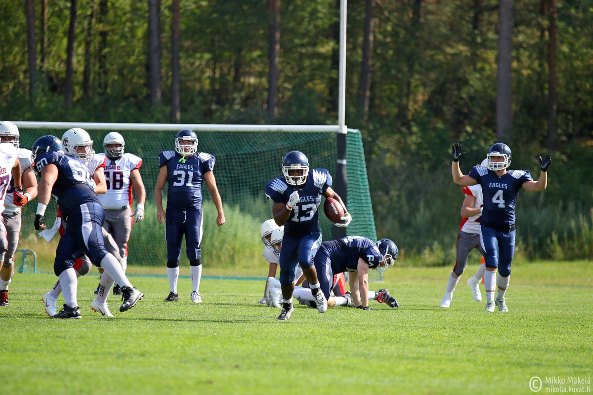 Eagles – Crusaders 42–14 (27–0)Kotka Eagles vankisti asemiaan Miesten I-divisioonan toisesta sijasta ottamalla lauantaina kotikentällään vakuuttavan 42–14 voiton United Newland Crusadersista. Jo avauspuolikkaalla karanneet kotkat hallitsivat peliä pallon molemmin puolin eikä jättänyt Länsi-Uudeltamaalta saapuneille vierailijoille juurikaan sanansijaa. Hyökkäysjaardit isännille 508–214 – Niclas Carpelan (236 jaardia, kolme alustettua touchdownia) ja Jerell Jones (207 jaardia, kaksi touchdownia) ovat löytäneet hyvän kemian, josta on vielä kotkalaisille paljon iloa edessä siintävissä pudotuspeleissä. Kapealla rosterilla aurinkoiselle Puistolan kentälle saapuneet ristiretkeläiset eivät avauspuolikkaalla löytäneet keinoja kotkapuolustuksen murtamiselle. UNC:n hyökkäysvuorot jäivät useasti lyhyiksi, kun taas Eagles pallon saatuaan oli kliininen: viidestä hyökkäysdraivista neljä päättyi touchdowniin. Isäntien avauspuolikkaan maaleista vastasivat Ville Hämäläinen, Munchie Roberts ja kahdesti onnistunut Jones. Etenkin Jonesin ensimmäinen maali oli upeaa katseltavaa: ensimmäisellä pelillä omasta maalialueen läheisyydestä lähteneelle juoksulle matkaa kertyi 90 jaardia ja lopputuloksena tuomariston kädet taivasta kohti. Taukolukemat 27–0, kun Jani Heinisalo onnistui kolmessa lisäpistepotkussaan. Toinen puoliaika starttasi tasaisena ja UNC:n kone rupesi hiljalleen lämpenemään. Crusaders onnistuikin ottamaan syvällä kotkalaisten päädyssä tärkeän syötönkatkon ja seuranneella hyökkäysvuorollaan kaventamaan eroa seitsemällä pisteellä. Maalintekijänä kukapa muukaan kuin Ryan Tuiasoa, venyttäen maalintekoputkeaan nyt kuuden ottelun mittaiseksi. Teemu Lintunen potki illalla molemmat lisäpistepotkut anturoiden väliin. Eagles ei maalista hätkähtänyt vaan jatkoi säntillisesti pitkien hyökkäysten turvin painostustaan ja pelikellon kulumista. Palkintona toisella puolikkaalla kaksi touchdownia. Markus Petman ja, illan toisellaan, Hämäläinen pääsivät nauttimaan Carpelan tarjoilusta sekä tuulettamaan maalialueella. Mikko Finne kavensi vielä loppulukemiksi 42–14 ennen peliajan umpeutumista. Molemmat vierailijoiden maaleista syntyivät turnovereista, otettujen syötönkatkojen seurauksena. Crusadersille tappio tiesi sarjan kakkospaikan haaveiden murenemista. UNC:lla on edelleen mahdollisuus nousta I-divisioonan kolmanneksi voittamalla päävastustajansa Giants seuraavalla kierroksella. Eaglesin kauden viimeinen peli on vajaan neljän viikon kuluttua Helsingissä niin ikään Giantsia vastaan. Voitolla kotkat varmistaisivat kotiedun välieriin. Pisteet: Eagles: Ville Hämäläinen 12, Jerell Jones 12, Munchie Roberts 6, Markus Petman 6, Jani Heinisalo 4, Esa Vanhoja 2 Crusaders: Ryan Tuiasoa 6, Mikko Finne 6, Teemu Lintunen 2