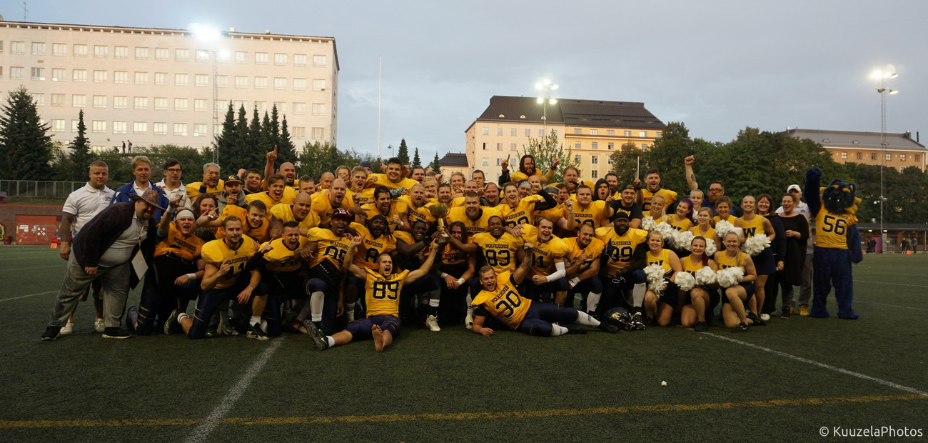 Spagettimaljassa kaatui Kotka Eagles 42-8 (28-0) Wolverines päätti voitollaan kahden spagettimaljan tappioputken ja voitollaan nousee Vaahteraliigaan kaudelle 2019. Eagles aloitti ottelun vahvasti. Se eteni ensimmäisellä hyökkäysvuorolla läpi kentän ja kulutti kelloakin yli puolet ensimmäisestä neljänneksestä, mutta vauhti pysähtyi Wolverinesin 16-jaardin linjalle jaardin vajaaksi uusista yrityksistä. Kotkan edetessä pääasiassa lyhyillä peleillä, Wolverines puolestaan eteni pitkillä peleillä. Arttu Erkkilän ja Kam Harriksen kiinniotoilla päästiin heti ensimmäisellä hyökkäysvuorolla maalialueen tuntumaan, josta Harris juoksi avauspisteet kotijoukkueelle kun ensimmäistä neljännestä oli jäljellä hieman yli kaksi minuuttia. Eaglesin seuraava hyökkäysvuoro käynnistyi hyvin. Muutamalla heitolla joukkue eteni lähes puoleen kenttään, mutta tie pysähtyi pallonkantajan rähmäykseen heti puolen kentän jälkeen. Eagles puolustus onnistui hidastamaan Wolverinesin hyökkäystä, mutta pysäytykseen asti se ei päässyt. Harris juoksikin Wolverinesin 14-0 johtoon Tomi Jokisen lisäpisteellä, kun toista neljännestä oli jäljellä 8 minuuttia. Kun Eagles päätyi lentopotkuun seuraavassa hyökkäysvuorossa käyttäen kello hieman yli minuutin, oli Wolverinesilla käsissään mahdollisuus lähteä karkumatkalle. Wolverines käyttikin tilaisuuden hyväkseen ja siirtyi 21-0 johtoon Arttu Erkkilän napattua Robert Johnsonin lyhyen heiton hyppysiinsä maalialueella. Seuraavassa hyökkäysvuorossa alkoi olla jo ratkaisun makua. Eagles käynnisti hyökkäysvuoronsa omalta kenttäpuoliskoltaan, mutta pitkä heitto yritys päättyi Richard Chungongin 53-jaardin syötönkatkonpalautusmaaliin. Jokisen potkaistessa lisäpisteen sisään, siirtyi Wolverines puoliajalle 28-0 johdossa. Toisen puoliajan ensimmäisellä hyökkäysvuorolla Wolverines eteni tasaisesti lyhyillä juoksuilla ja heitoilla, kunnes Johnson tavoitti Marcus Siiskosen 21-jaardin heitolla maalialueelta. Wolverinesin 35-0 johtoon siirsi kaikki lisäpisteet onnistuneesti potkinut Jokinen. Eagles vastasi pitkällä hyökkäysvuorolla, jonka päätteeksi Niklas Carpelan syöksyi maalialueelle 1-jaardin juoksulla. Eaglesin lisäpistepelissä Carpelanin heitto tavoitti Jani Heinisalon kaventaen tilanteeksi 35-8. Tänään ei kuitenkaan tämän tiukempaa tilannetta. Wolverines teki vielä yhden maalin kolmannen neljänneksen loppuun Niko Kantosen kiinniotolla Johnsonin heitosta puolesta kentästä. Tämän jälkeen lisäpistesuorituksia ei enää nähtykään, vaikka molemmat joukkueet kertaalleen etenivätkin lähelle vastustajan maalialuetta. Joukkueiden parhaina palkittiin Eaglesin Kaleb Wezdenko ja Wolverinesin Arttu Erkkilä. Wolverines pelinrakentaja Robert Johnson nappasi puolestaan ottelun arvokkaimman pelaajan palkinnon. Wolverines päävalmentaja Kari Titola oli onnellinen voitosta ja koko joukkueen erinomaisesta pelistä – ”Hienoa nähdä, että koko joukkue pelasi parhaan pelinsä silloin, kun se eniten merkitsi. Erityismaininta puolustukselle, joka vuosi sitten finaalissa päästi 70 pistettä ja tänään teki yhtä monta pistettä kuin päästi.”