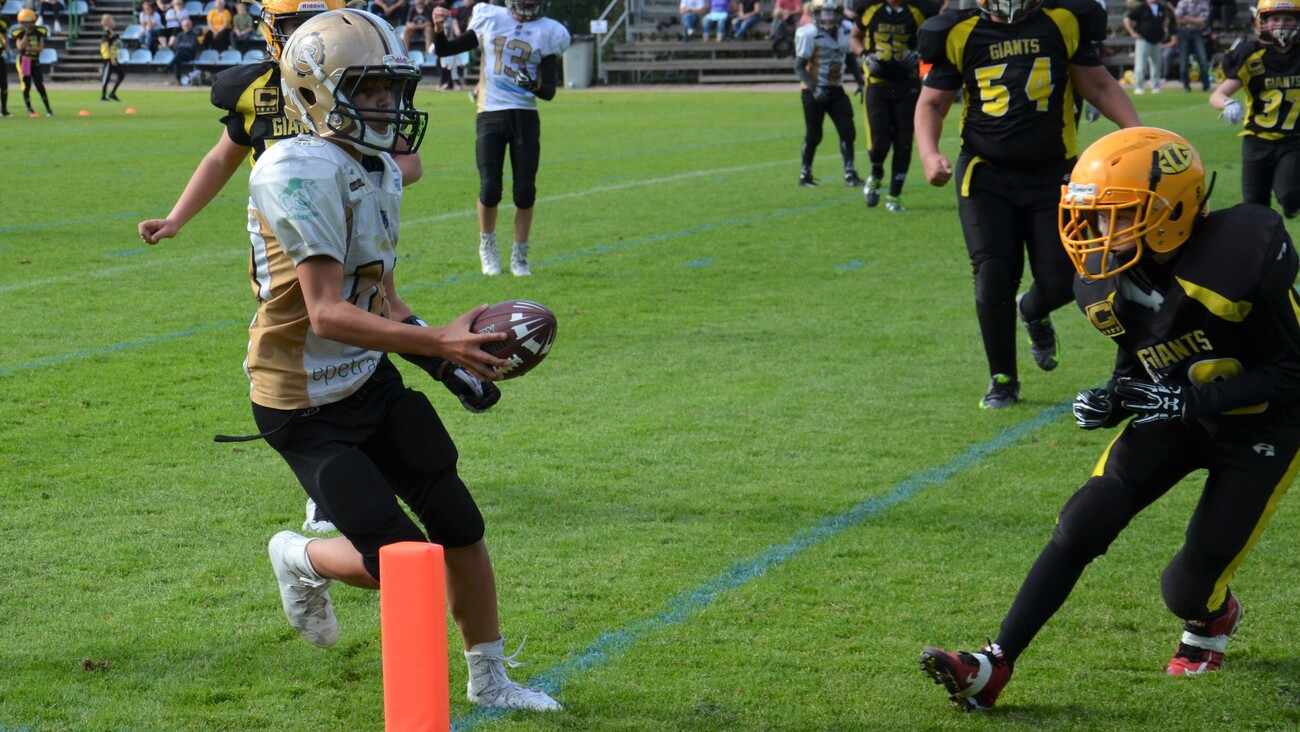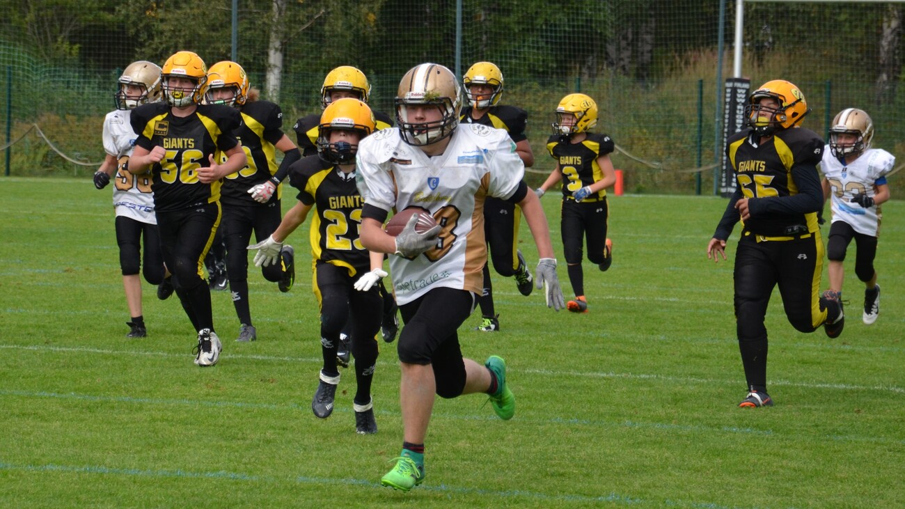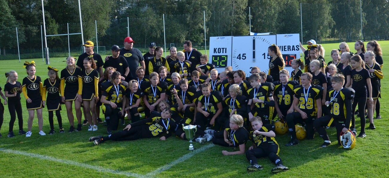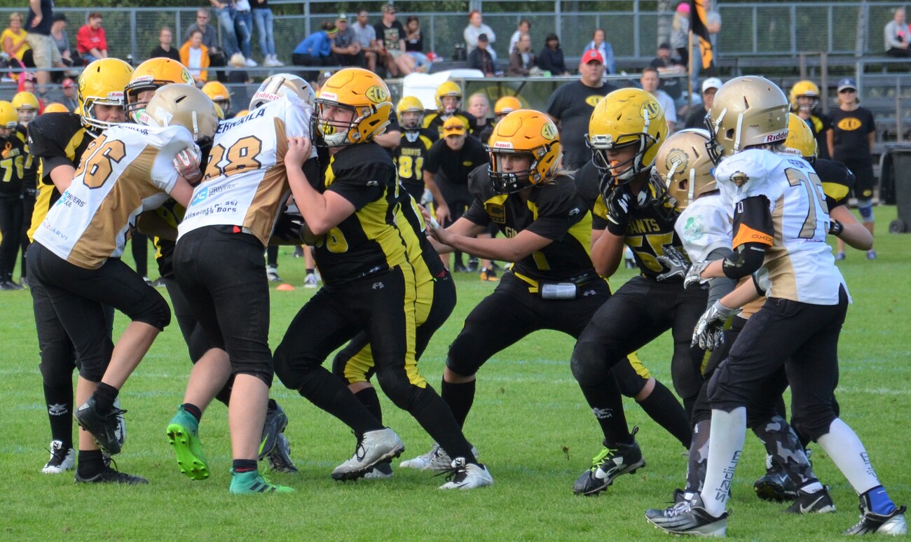 Porvoo Butchers pisti kampoihin puoleen väliin ottelua, jonka jälkeen Helsinki East City Giants meni menojaan ja voitti ottelun 42-12 (18-12). Aurinkoinen keli suosi Helsingin Giants stadiumia Myllypurossa. Lähes kaksisataa U13 jenkkifutiksen ystävää seurasi ikäluokan kahden parhaan joukkueen kamppailua. Järjestelyt olivat ihanteelliset: kahvio palveli yleisöä, nurmikenttään oli piirretty täsmälleen oikean kokoinen kenttä, ottelussa oli kuuluttaja/dj sekä mukana finaalissa oli maanmainio Giants cheerleader-ryhmä. Finaalin seremonioihin kuului myös Maamme-laulun esitys. Pelin ensimmäinen puolisko oli tasaista vääntämistä. Butchers teki ensimmäisen osuman ja siirtyi 0-6 johtoon Luukas Eerola kiinniotolla. Pallon hänelle toimitti Nooa Olsson. Erikoinen piirre ottelussa tuli olemaan se ettei kumpikaan joukkue onnistunut yhdessäkään lisäpistepelissä. Hetken päästä Giants marssi lähelle maalialuetta. Juulio Vahla tasoitti tilanteen ottamalla kiinni Nooa Kurjen heiton ja ottelu oli tasan 6-6. Giantsin hyökkäyksessä juoksu oli pääosassa ja pallonkantamisesta suurimman osan hoiti Anton Norta. Hän kipitti valmentajien scouttaamaa vasemman puoleista väylää menestyksellä. Linjamiestrio Juuso Linja, Alexander Huhtaniemi ja Olli Hakkarainen saivat juoksupeleissä aukkoja Nortalle siinä määrin, että hän vei Giantsin johtoon 12-6 juoksumaalillaan. Butchersin pallonkantaja Luukas Eerola kiitti luottamuksesta ja mursi muutaman taklauksen ja kirmasi vasen reunaa pitkin 57 jaardia maaliin. Giants stadiumin sähköiselle tulostaululle ilmestyivät lukemat 12-12. Eero Vitikaisen kädet olivat kiinniottokunnossa, kun Giants maalasi seuraavan kerran. Vitikainen venytti itsensä maalialueelle ja ECG siirtyi kutkuttavasti 18-12 johtoon kun aikaa oli jäljella 6:53 toisella neljänneksellä. Yksi ottelun kulminaatiopisteistä nähtiin muutamaa minuuttia myöhemmin. Butchers haki kiivaasti tasoitusta. Luukas Eerola otti pitkän Nooa Olssonin heiton kiinni ja hänet taklattiin aivan maalialueen tuntumaan. Butchers yritti 5 jaardin päästä maalia ja onnistuikin siinä heti ensimmäisellä yrityksellä, kun qb Olsson juoksi itse maaliin. Porvoolaisten epäonneksi hyökkäysmiehistö oli ryhmittynyt väärin ja maali hylättiin. Kolmannen jakson alussa Roni Elorannan ja Vitikaisen kiinniotot toivat Giantsin maalintekoetäisyylle. Porvoolaisten takakentällä urakoinut Nooa Olsson venyi kuitenkin syötönkatkoon. Butchersin takaa-ajovaiheessa East City Giantsin takamies Janne Kuoppamäki otti paraatikopillaan syötönkatkon. Molempien joukkueiden pelinrakentajien Nooa Olssonin ja Nooa Kurjen otteet läpi ottelun olivat varsin mallikkaita; pallojen siirtäminen tapahtui rutiininomaisesti ja heittäminen oli kohtuullisen tarkkaa. Porvoon Antti Erkkilä ja Waltteri Turunen taklasivat ahneesti läpi ottelun. Varsinki tukimies Turunen torpedoi useimmat juoksupelit heti alkumetreille. Hänestä tullaan kuulemaan vielä. Ottelun parhaat: Team MVP rb/wr Luukas Eerola, Porvoo Butchers Valokuvia ottelusta: KuuzelaPhotos East City Giants saavutti päävalmentaja Henri Kurjen opastamana toistamiseen SM-kultaa.
