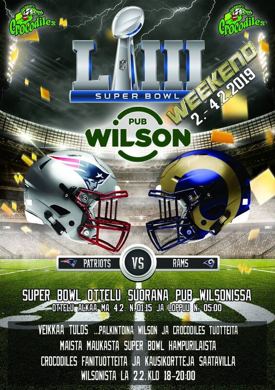 Siirry tapahtuman Facebook-sivulle. Crocodiles järjestää Super Bowl-viikonlopun Pub Wilsonissa Seinäjoella! Crocodiles kausikortteja ja fanituotteita saatavilla Wilsonista lauantaina 2.2. klo 18-20. Super Bowl ottelu suorana Pub Wilsonissa sunnuntain ja maanantain välisenä yönä n. klo 01:15 alkaen. Veikkaa ottelun lopputulos ja maista maukasta Super Bowl-hampurilaista. Kartta. Ravintolan sivut. Super Bowl-tapahtumia koko perheelle