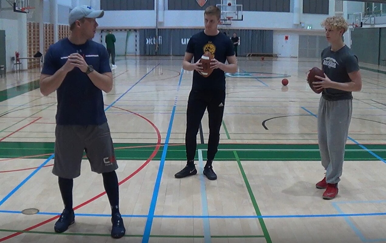 Penkin opit otettiin vastaan innostuneesti ympäri Suomea. Leireihin ja koulutuksiin osallistui 22 seuraa, 34 pelinrakentajaa sekä 35 valmentajaa. Texasista Suomeen lennähtänyt pelinrakentajavalmentaja Petrus Penkki aloitti valmennusurakkansa Solvallan leirillä 20.tammikuuta ja päätti sen 1-tason Air-valmennuskurssilla 3. helmikuuta. Väliin mahtui toinen leiri Seinäjoella sekä nuorten maajoukkuepelinrakentajien harjoittamista Mäkelänrinteen urheilulukiossa. Petrus Penkin pelinrakentajakoulutuksiin osallistui yhteensä 34 pelinrakentajaa sekä 35 valmentajaa. Seurat olivat aktivoituneet koulutuksiin laajalla rintamalla ja mukana koulutuksissa oli yhteensä 22 eri seuraa. - Leirit olivat erittäin hyvä kokemus omasta puolestani. Leireillä oli paljon eri-ikäisiä suomalaisia pelinrakentajia ja seuraavia valmennustapahtumia on helpompi suunnitella. Saimme myös paljon videomateriaalia harjoituksista. Jatkossa voimme myös tuottaa jakelukelpoista materiaalia, kun drillit ja kuvakulmat on mietitty ennakkoon. Koulutuksissa valmentaja-pelaaja-akseli on erittäin toimiva tapa jalkauttaa osaamista. Petrus Penkin ensimmäiseltä mentorilta NFL coach Ken Meyerilta siirtyneet opit pätevät edelleen. Penkki korosti katseen ratkaisevaa merkitystä. Ripeällä jalkatyöllä ei ole paljon merkitystä jos pelinrakentaja tuijottaa kengän kärkiään. Penkki korosti tekniikkaharjoittelusta lantion oikeaoppista käyttöä, jonka avulla heittoon saadaan ”sinappia” aivan eri voimalla. - Futis on muuttunut vuosien saatossa. Enää kukaan ei heitä 7 askeleen dropista 20 jaardin poikkikuvioita. No-huddle on muuttanut pelin. Peliä on yksinkertaistettu ja kentällä liikutaan nopeasti. Texasin high school futiksessa ei välttämättä käydä huddlessa ollenkaan. Nykyään vallalla oleva pitkä aloitussyöttö shotgun ja spread-muodostelmat ovat selkeyttäneen pelinrakentajan toimintaa. Pelinrakentajan on helpompi tunnistaa blitzit ja heittosuojauksen kutsuminen helpompaa Pelinrakentajan on harjoiteltava keskimäärin enemmän kuin muiden pelipaikkojen pelaajien. Ensin on oltava tarkka heittäjä, jonka jälkeen voidaan opetella reagointeja esimerkiksi eri heittopuolustuksia vastaan. - Ei kannata tehdä mitään mihin ei ole fyysisiä valmiuksia. Jos pelinrakentaja ei pysty heittämään 90% varmuudella hitchiä, niin miten vaikeammat kuviot voisivat onnistua tehokkaasti. Fokuksen pitää olla heti harjoituksen alusta lähtien kunnossa. Valmentajien tulee vaatia heti ensimmäisistä easy upeista lähtien terävää suorittamista. Se vie eteenpäin Valmentajan tulee jalostaa omaksi hyökkäystavakseen sellainen systeemi, jonka tuntee hyvin. Heittopelien tulee sitoutua juoksupeleihin ja toimia niiden jatkumoina. Pelinrakentajan pelaaminen on jatkuvaa päätöksentekoa. - Texasissa teen esimerkiksi10-vuotiaan pelinrakentajan aina harjoituksen lopuksi 2-minuutin hyökkäysharjoituksen. Kerron hänelle mielikuvan kentällä, kuten kaksi safetyä ja hyökkäyksellä on kolme kuviota fade, hitch ja slant. Kenelle qb heittää? On tärkeää totuttaa pelinrakentaja tekemään päätöksiä Yksityiskohtien hiominen kuuluu myös pelinrakentajan arkeen. Penkki haluaisi kiinnittää huomiota esim. pelikutsun kertomisen rytmitykseen sekä aloitussyötön simulointia jatkuvasti. - Kutsu peli kerran ja rytmikkäästi. Pelikutsumisen liittyvät pienet tauot ja paloittelu, josta eri hyökkäyspelaajat saavat oman osuutensa pelikutsusta.