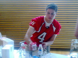 ![]() Roostersin amerikkalainen pelinrakentaja Ryan Rufener toimi koehenkilönä Vaahteraliigan lehdistötilaisuuden yhteydessä pidetyssä adt-koulutuksessa. |