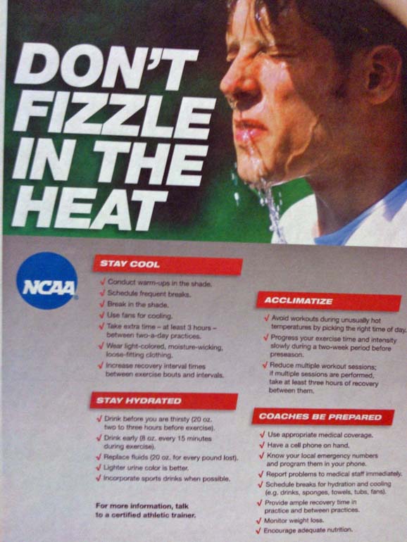 Kuumassa pelkän runsaan veden juominen tilanteessa, jossa menetetään hikoilun kautta myös natriumia, voi johtaa natriumin vajeeseen. Urheilijan on Ateenan tyyppisissä olosuhteissa suotavaa juoda veden lisäksi urheilujuomaa, jossa on sekä sokeria että suoloja antamassa energiaa ja korvaamassa nestehukkaa. On huomattava, että urheilujuomat eivät ole niin tehokkaista nestehukan palauttajia kuin ruokailu ja sen kautta saatavat suolat.