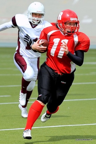 ![]() Vuonna 2002 jenkkifutikseen tutustunut Anni Kivikataja haluaa olla nimenomaan hyökkäyksen koordinaattori. "Hyökkäys on valmiiksi suunniteltua, mietittyä ja roolitettua. Puolustus on enemmän reagoimista", Kivikataja perustelee. Kuva: Jari Turunen | ![]() Anni Kivikataja on hankkinut kokemusta jenkkifutiksesta myös tuomarin roolissa. Kuva on Vaahteraliiga-kaudelta 2013. Kuva: Sami Ranta |