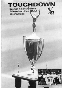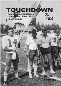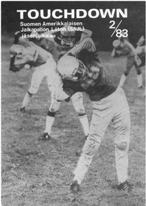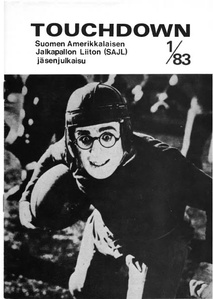 ![Suomessa pelattiin vuonna 1983 amerikkalaista jalkapalloa kymmenellä paikkakunnalla.]() SAJL tiedotuslehti englanniksi 1983 | ![Kansikuvassa mykän elokuvan sankari Harold Lloyd elokuvasta Keltanokka ( The Freshman) vuodelta 1925.]() SAJL jäsenjulkaisu Touchdown 1/1983 | ![Pelaajia verryttelemässä maajoukkueen treeneissä Ruskeasuon Invalidisäätiön nurmella.]() SAJL jäsenjulkaisu Touchdown 2/1983 |