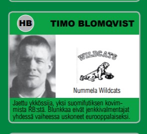 Timo Blomqvist on pelipaikallaan (RB) ehdottomasti yksi kaikkien aikojen parhaista suomalaisista pelaajista. Hänellä oli ratkaiseva merkitys Vaahteramaljoissa 1995,1996,1997 ja 1998 Helsinki Roostersin voitoissa. Hän oli myös isossa roolissa EM-finaalissa 1995, jonka Suomi voitti.
