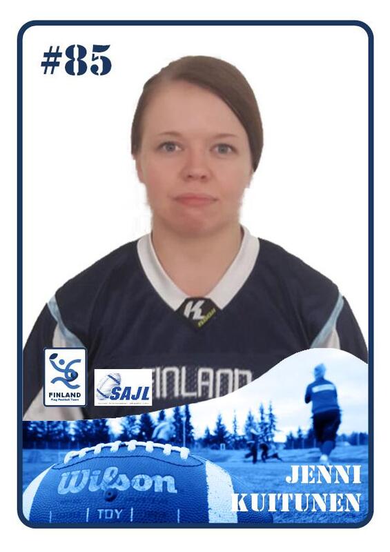 Jenkkifutis- ja lippupallotreenit tukevat toinen toistaan ja pelaaminen on lisäksi vielä todella hauskaa. Meillä on mielettömän ihana joukkue ja naurua ei treeneistä puutu! Mistä innostus / mikä sai sinut aloittamaan flagin? Jenkkifutista on tullut harrastettua jo useita vuosia Mikkelissä. Kun Bouncers päätti osallistua flagin Halli sm-sarjaan niin olihan se tietysti pakko lähteä mukaan. Jenkkifutis- ja lippupallotreenit tukevat toinen toistaan ja pelaaminen on lisäksi vielä todella hauskaa. Meillä on mielettömän ihana joukkue ja naurua ei treeneistä puutu! Pelipaikka / mikä siinä viehättää? C/F/QB. Hyökkäyspelaaminen on etukäteen suunniteltua kuvioiden toteuttamista, mutta vaatii kuitenkin todella hyvää pelinlukutaitoa. Jokaisen pelaajan täytyy suorittaa oma paikkansa paremmin kuin hyvin jotta päästään maaliin asti. Miksi kannattaisi aloittaa flagin pelaaminen? Se kehittää niin fyysistä puolta kuin peliälyä. Nopeatempoinen peli, jossa tarvitaan taktiikkaa, nopeutta, ja reagointikykyä. Itseään pääsee haastamaan ja kehittämään jatkuvasti. Parhaita fiiliksiä on, kun kentällä tulee onnistumisia. Joko itselle tai muille. TOP4 Euroopan joukkuetta EM-Israelissa? Tanska, Suomi, Iso-Britannia, Israel |