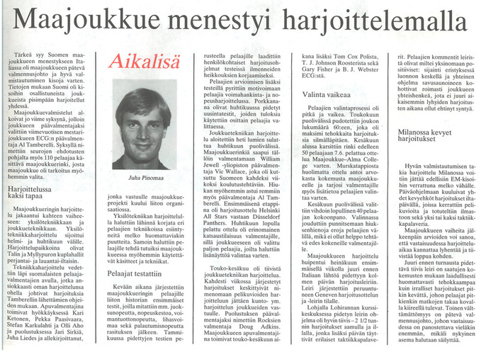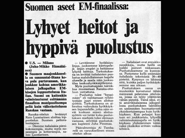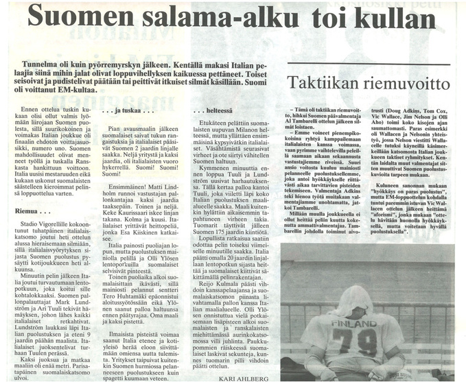 Suomen maajoukkueen päävalmentaja Al Tambarelli loisti kuin Naantalin aurinko ottelun jälkeen. Hänen valitsemansa taktiikka osui aivan nappiin. -Peli oli kuin nyrkkeilyottelu, jossa vastakkain olivat raskaan sarjan ja kevyen keskisarjan nyrkkeilijät. Suomen pienet, mutta tekniset pelaajat onnistuivat pysymään loitolla isoista ja vahvoista italialaisista ja tekemään pistesuorituksia yllättäen, riemuitsi Tambarelli. Tambarellin valitsema puolustusvoittoinen taktiikka yllätti italialaiset täysin. -Vahvat puolustajamme Harri Kaasinen ja Matti Lindholm kykenivät pitämään italialaiset poissa maalialueeltamme ja se ratkaisi lopulta voiton, Tambarelli kommentoi.