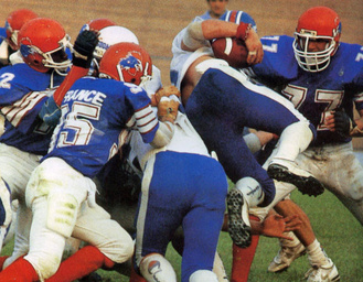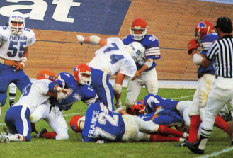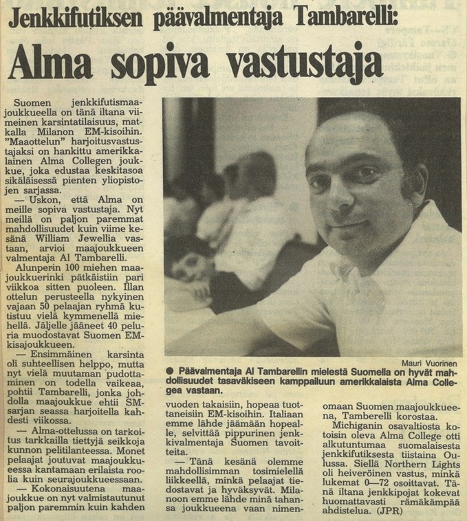 Maajoukkue pelasi toisen kerran USA:laista yliopistojoukkuetta vastaan vuonna 1985. Ottelun areenana oli suomalaisen jenkkifutiksen pyhättö Helsingin Pallokenttä, jonne saapui michiganilainen Alma College Scotts. Ottelussa oli samanlaiset sävelet kuin vuotta aiemmassa Cardinals-ottelussa. Suomalaiset saivat aikaan muutamia kunnon hyökkäyksiä, jotka päättyivät puoleenkenttään. Ottelussa maajoukkueen päävalmentaja new yorkilainen Al Tambarellin tarkkaili 48 suomalaispelaajaa matkalla EM-kisoihin, jotka järjestettiin heinäkuussa Italiassa.