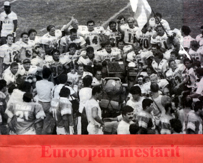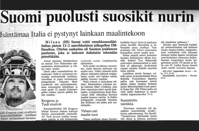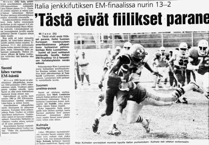 Suomi voitti ennakkosuosikki Italian pistein 13-2 amerikkalaisen jalkapallon EM-finaalissa Milanossa fanaattisen italialaisyleisön nenän edessä. Ottelun sankarina oli Suomen joukkueen puolustus, joka ei laskenut italialaisia tekemään pistettäkään. -Tästä eivät enää fiilikset parane, iloitsi Suomen Euroopan Mestaruuteen amerikkalaisessa jalkapallossa luotsannut pelinrakentaja Risto Luostarinen.