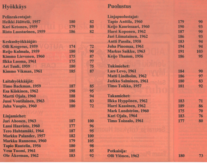 Yksi ottelun yllättäjiä oli väkivahva tamperelainen keskushyökkääjä Reijo Kulmala, joka eteni ottelussa mallikkaasti. Pelinrakentajista paras oli Risto Luostarinen. Puolustuksessa näyttävimmät suoritukset teki kaksi kertaa Alman heitot katkaissut Harri Kaasinen. Matti Lindholm oli puolestaan puolustustuksen keskushahmo. Ottelu päättyi 0-53 (0-27) amerikkalaisten voittoon.