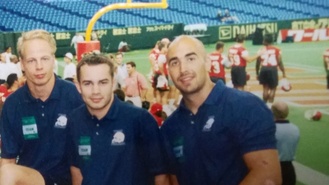 ![]() Tokio Dome stadionilla vas. wr Sampsa Pesonen, wr Juuso Marno ja db Karim Hammoud. | ![]() Lehdistötilaisuudessa suomalaiskolmikko oikealta lukien: potkaisija Kari Grönroos, pelinrakentaja Petrus Penkki ja päävalmentaja Jorma Hytönen. Hytösen vasemmalla puolella Reijo Ailasmaa. |