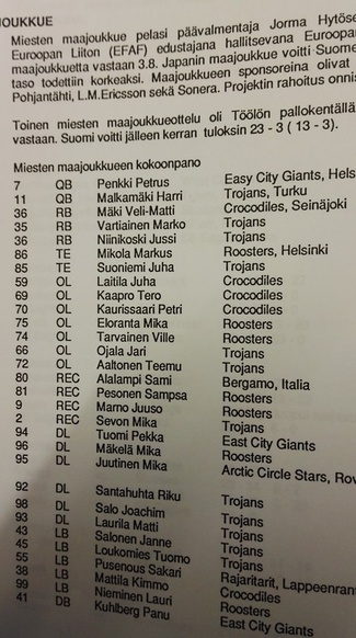 Suomalaisen jenkkifutishistorian yksi suurimmista hetkistä ajoittui tasan 20 taakse Tokioon. Suomen maajoukkue edusti Eurooppaa NFL:n sponsoroimassa Japan-Eurobowl ottelussa, jonka japanilaiset voittivat lukemin 39-7.
