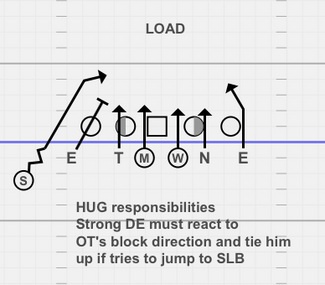 The guard will or will not try to follow the B-gap rusher. The rule for DE is that if the G is clinging on to the DT, he will scrape underneath both of them. If they’re separated he will work as tight underneath DT’s hip as possible.