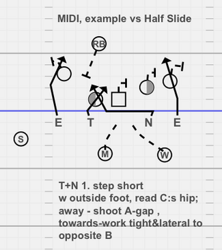 The guard will or will not try to follow the B-gap rusher. The rule for DE is that if the G is clinging on to the DT, he will scrape underneath both of them. If they’re separated he will work as tight underneath DT’s hip as possible.