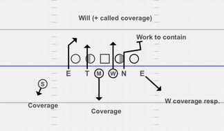 The basic idea of the Wide Package is to use the DL and the LBs of a 43 defense from a single look in multiple ways to keep the offense under pressure and guessing. The word Wide refers to the DL alignment, both DTs are lined in a 3-tech over the guards, the DEs line up in wide 5 technique (also called 6 or ’Jet’). MLB and WLB line up over the A-gaps and SLB creates the 7-man threat with positioning adjusted to the offensive formation.