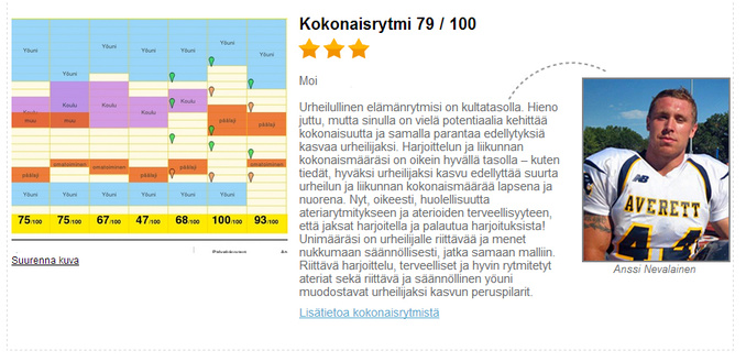 Elämänrytmitesti kertoo kuinka hyvin harjoitus- ja liikuntamäärät sekä uni- ja ateriarytmi vastaavat urheilijaksi tähtäävälle nuorelle asetettuja suosituksia. Testissä syötetään viikon ajan kalenteriin harjoitus-, liikunta-, uni-, ateria- ja koulunkäyntiajat. Testin voi aloittaa mistä viikonpäivästä tahansa. Yhden päivän syötön jälkeen urheilija näkee päiväkohtaiset pisteensä ja saa pikapalautteen päivästä. Viikon jälkeen testi on valmis ja urheilija saa yksityiskohtaisen ja asiantuntevan kokonaispalautteen.