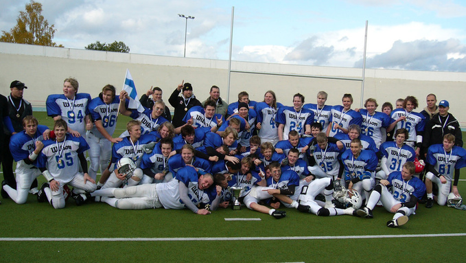 Vuoden 2008 U16-joukkueelle selkävoitto Ruotsista 33-6. Tiettävästi tämän ikäluokan ensimmäinen virallinen maaottelu maailmassa lajissamme pelattiin Velodromilla hienoissa tunnelmissa.16-vuotiaiden maajoukkueelle Pohjoismaiden mestaruusSuomen alle 16-vuotiaiden maajoukkue voitti Ruotsin 33-6 ja samalla Pohjoismaiden mestaruuden. Alunperin ikäluokan PM-kisat oli tarkoitus järjestää Tampereella, mutta poisjääntien takia kisat kutistuivat Velodromilla pelattuun Suomen ja Ruotsin väliseen otteluun. Ruotsi oli edellisenä viikonloppuna pelannut Norjaa vastaan Tukholmassa ottelun ja voittanut sen 8-7. Suomi oli valmistautunut otteluun huolellisesti ja Ruotsin ensimmäinen hyökkäysdraivi päättyi lentopotkuun. Päävalmentaja Tero Virtasen lentopotkun blokkikuvio onnistui täydellisesti ja Lauri Anttila poimi blokatun potkun jälkeisen irtopallon ja kiiti 9 jaardia maaliin. Mikko Sormunen latasi lisäpisteen varmasti. Ensimmäinen neljännes sujui todella hienosti nuorten leijonien kampittaessa ruotsalaisia lähes joka alueella. Puolustus piti kutinsa todella tarkasti ja voimakasta juoksupuolustusta suoritti Victor Sarvi, joka dt asemista otti useita linjan takana tapahtuneita taklauksia. Yksi Suomen hyökkäyshahmoista oli linja kokonaisuudessaan, joka sai avoimella kentällä lähes pysäyttämättömän Mickey Kyein hurjaan pallonkantovireeseen. Ensimmäisen maalinsa Kyei pasautti 50 jaardia ruotsalaisia kierrellen ja kaarrellen. Sormunen lisäsi 14-0 numerot potkullaan. Ensimmäisen pelijakson varsin varman oloisesti pelasi pelinrakentaja Santeri Supi. Hän onnistui löytämään 65 jaardin verran kolmella kopilla laitahyökkääjä Jukka Lautamattia. Suomen kolmannen maalin Supi viimeisteli itse juoksemalla sentteri Tapio Jääskeläisen selän takaa lähietäisyydeltä. Sormunen potkaisi oululaislapikkaalla selkeän neljännesjohdon 21-0. Ruotsi ei saavuttanut yhtään ensimmäistä yritystä tällä jaksolla. Toinen jakso jatkui lähes samoissa merkeissä. Mickey Kyei porhalsi upean 89 jaardin maalin näyttäen pikajuoksunopeutta Ruotsin atleettisille takamiehille. Lisäpistepotku jäi huonon aloitussyötön vuoksi vajaaksi. Suomi johdossa 27-0. Suomalaisyleisö hurrasi kovasti ja jaksoi kannustaa läpi ottelun U16 urhoja. Hyökkäyskoordinaattori Andy Bezaire käytti vappupelikirjan sivulta yksi tuttua tuplaheittoa. Lyhyen sivulle suuntautuneen heiton Santeri Supilta otti vastaan toinen pelinrakentaja Mikko Seppänen, joka suuntasi lähes 50 jaardin maalin juosseelle Miro Lopperille tarkan syötön. Lopperi jaksoi taistella viimeiset taklaajat kinteriltään ja nosti Suomen turvallisen tuntuiseen taukojohtoon 33-0 lisäpisteen epäonnistuessa. 3. neljännes oli puolustusten taistoa. Suomen kovaa taklaavat ja jokapaikkaan ehtivät safetyt Ville-Valtteri Suojanen ja Niko Roiko pelasivat varmaa peliä. Ruotsi tukeutui heiton sijasta entistä enemmän juoksuun ja saikin muutaman ensimmäisen yrityksen. Rangaistusten johdosta Ruotsin 16-vuotiaat pääsivät yrittämään maalia 8 jaardin päästä, mutta Suomen muuri piti kutinsa. Neljännellä jaksolla Fredrik Dreifeldt kavensi loppunumeroiksi 33-6. Suomi piti pelaajavaihtosirkusta yllä ja menetti hieman rytmiä hyökkäystoiminnastaan. Puolustuksessa tilastoja koristelivat tukimies Otso Flinkman, joka otti yhden syötönkatkon ja blokkasi lisäpisteen sekä kantoi palloa 30 jaardia kohti Ruotsin päätyä. Ruotsi pyristeli vielä jonkin verran, mutta Johan Versluisin syötönkatko selvitti lopullisesti seikan, että Suomi on U16 sarjan kiistaton mestari vuonna 2008 Pohjoismaissa. Team MVP Suomi dt Victor Sarvi PM-kultaa Suomi: