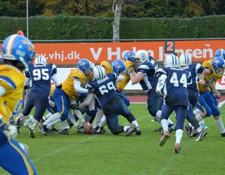 Tanska pääsi pitkällä heitolla ja henkilökohtaisen rikkeen johdosta 35 jaardin päähän maalista. Kolme heittoa meni kuitenkin harakoille ja linjapuolustaja Henri Toiminen kävi toistamiseen niittamassa tanskalaispallonkantaja Henry Mullerin Odensen nurmeen.
