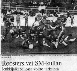 Lähes 4000 katsojaa todisti, kun helsinkiläisfinaalissa Roosters voitti Munkka Coltsin lopulta vain kahdella pisteellä 23-21 (6-0). Roosters otti kolmannen peräkkäisen SM-kullan, 34 ottelua ja kolme kautta kestäneen tappiottoman valtakauden kunniaksi. Jyrki Ahola teki ensimmäisen puoliskon ainoan maalin Roostersille. Toisella puoliskolla munkkalaisten hyökkäysvalmentaja Swearingen panosti heittoon. Colts tasoittikin Kimmo Punkan tekemällä heittomaalilla tilanteeksi 6-6. Tapio Heikkilän kenttäpotkumaali ja Jussi Arantolan juoksu pitivät Roostersin 16-6 johdossa. Colts kavensi pelinrakentaja Kallislahden juoksulla 16-13. Neljä kertaa ottelussa heittänyt Roostersin Kari Ketonen onnistui yllättämään munkkalaispuolustuksen ja Jari Hedman tekaisi heittopelistä 70 jaardia pitkän maalin tilanteeksi 23-13. Jarkko Pajarinen toi Coltsin mukaan peliin viimeisen neljänneksen heittomaalillaan, mutta joukkueen loppurutistus ei aivan riittänyt. Coltsin takamies Gent Mende taklasi yhdeksän kertaa ja Roostersin kärkitaklaaja Björn Åkerblom kaatoi vastustajan kuudesti. Coltsin valmentajan Ken Swearingenin tarkoituksena oli pitää Roostersin hyökkäys poissa kentältä, mutta myönsi taktiikkansa epäonnistuneen. Ari Tuuli lopetti jenkkifudisuransa ja hänet valittiin neljännen kerran MVP:ksi loppuottelussa.