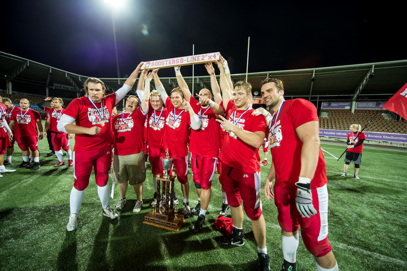 ![]() Roostersin linjapuolustajat juhlivat mestaruutta. |
