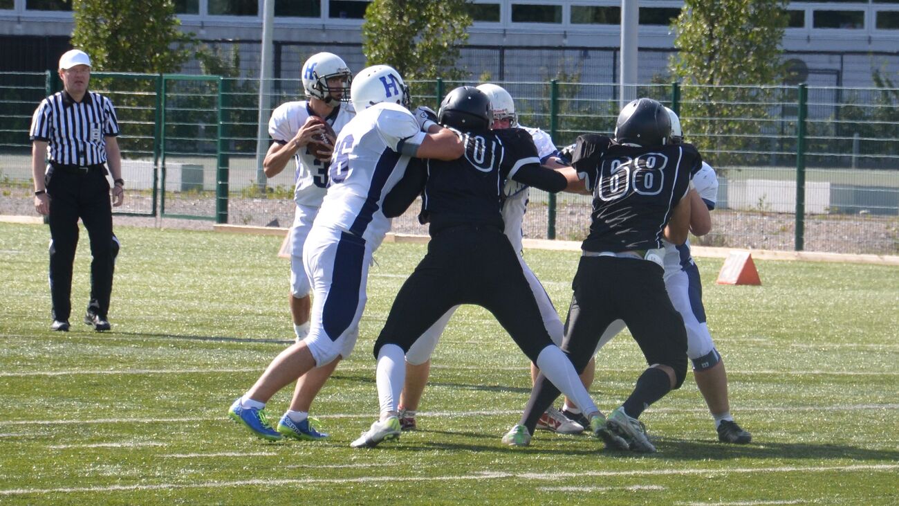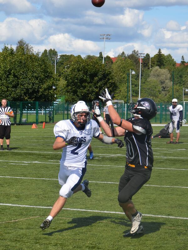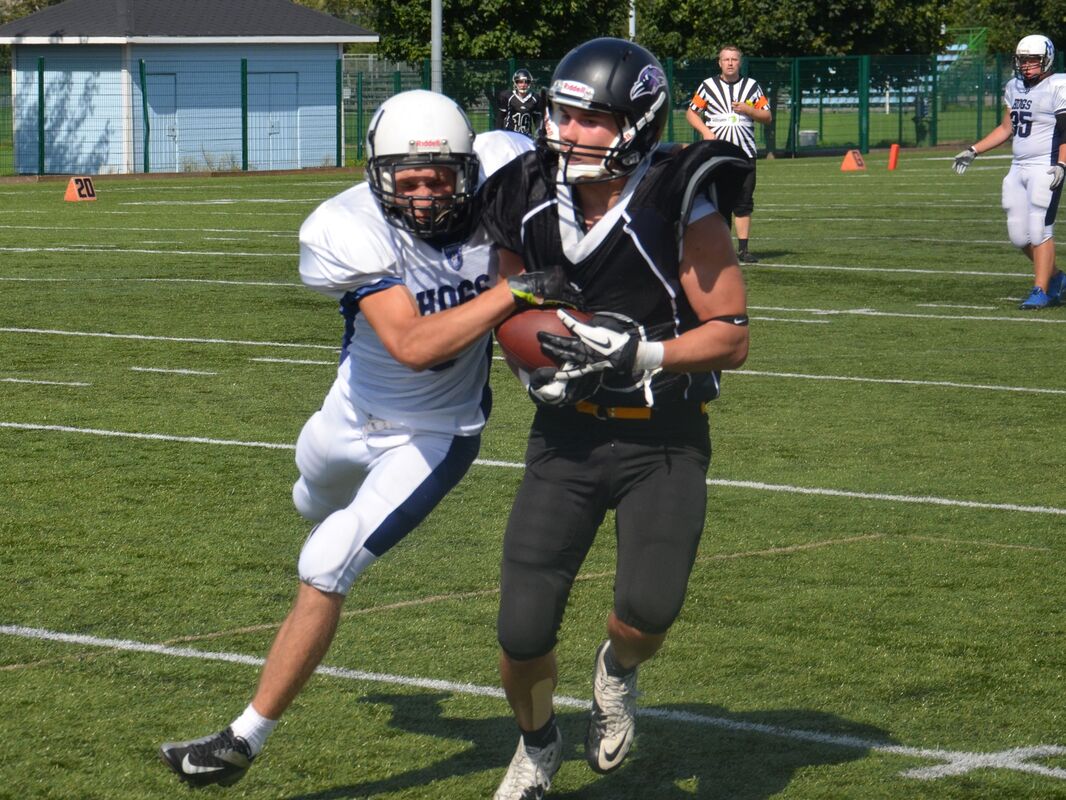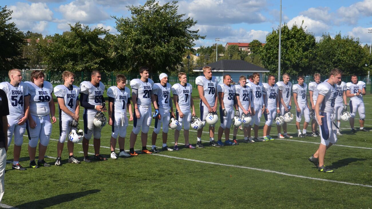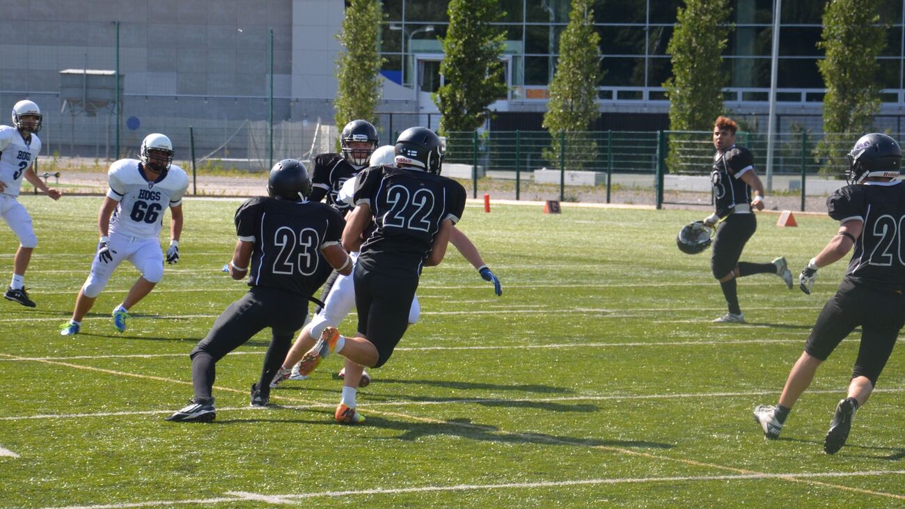 Pietari Hogs oli voittanut runkosarjassa kaikki kuusi otteluaan paukuttaen 306 pistettä ja kantoi ottelun ennakkosuosikin minkkiviittaa. U17 mestaruuden voittanut 69ers oli puolestaan saanut riveihinsä kaikki parhaat junioripelaajansa. Helsinki 69ersin keskushyökkääjä Timofei Telov aloitti maalikarkelot tekemällä pitkällä juoksupelillä avausmaalin kotijoukkueelle. Tämän jälkeen joukkueet vierailivat tasaiseen tahtiin Velodromin harjoituskentän maalipäädyissä. Pietarin kova luu oli sitkeästi palloa kantanut Anton Efimov, joka kavennusmaalin ja tasoitti ottelun tilanteeksi 22-22. Hogsin pelinrakentaja Dmitry Shorikov oli pelipäällä ja syöksyi seuraavalla Hogs hyökkäysvuorolla johtomaalin joukkueelleen. Lisäpistepeli epäonnistui. Hogsin siirtyi johtoasemaan 22-30. Helsinkiläisten 16-vuotias pelinrakentaja Oskar Drockila oli valmistautunut taistelemaan voitosta ja onnistui heittämään isoveljelleen Robin Drockilalle 60 jaardin maalin post-kuvion päätteeksi. Robin Drockila onnistui myös lisäämään 2 pistettä kiinniotollaan, jolla tilanne tasoittui 30-30 numeroihin. Päävalmentaja Kai Lindblad vetäisi valmentajan hatustaan oikea-aikaisen onside-potkun ensimmäisen pelijakson loppuvaiheissa. Potkaisija Kari Hassinen toteutti mallikkasti lyhyen potkun ja Miro Salminen peitti irtopallon. 69ers käytti momentumin hyväkseen ja Drockila heitti samantien kentän hahmoksi nousseelle Alexander Wasiljeffille pitkän maalin. Helsinkiläiset siirtyivät taukojohtoon 36-30. Toisella pelipuoliskolla Anton Efimov juoksi tasoitusmaalin 36-36 ja lisäpisteet kiertopelin muodossa 36-38. Tämän jälkeen käytiin ottelun puolustusherruudesta kovaa kamppailua. Venäläisten kulmapuolustaja peitti fumblen ja Hogs eteni eteni hyökkäysvuorollaan voimakkaasti aina viiden jaardin päähän 69ersin maalista. Takakentällä pelannut Alexander Wasiljeff pelasi tarkasti käyttäen kiinniottajan taitojaan puolustuksen puolella ja katkaisi syötön. Päätuomari Kalle Kivimaan piti molemmat joukkueet hyvin omissa karsinoissaan ja ottelu eteni hyvätasoisena. 69ers otti keskellä kenttää riskin ja pelasi 4. yrityksenä, mutta epäonnistui siinä. Hogsin hyvä drive eteni jälleen maalialueen tuntumaan, mutta tyssäsi Elias Ericssonin huippuminuuttiin. Ericsson lämäsi heitetyn pallon kertaalleen maahan ja onnistui seuraavassa yrityksessä syötönkatkossa. Oskar Drockila heitti ensin 40 jaardin verran Alexander Wasiljeffille ja tämän jälkeen Timofei Teloville, joka luikerteli kolmen jaardin päähän Pietarin maalista. Telov voitti varjostajansa vielä kertaalleen ja vei helsinkiläiset johtoon 42-36, kun ottelua oli neljä minuuttia jäljellä. Wasiljeff lisäsi johdoksi 44-38. Hogs tuli uhkaavasti pelinrakentaja Shorikovin kolmella onnistuneella heitolla maalintekoalueelle. Shorikov piti ohjakset käsissään ja juoksi itse kolmella seuraavalla yrityksellä aina maaliin asti. Pietarilaisten riemuksi Shorikov onnistui vielä lisäpiste-juoksussaan ja vei vierasjoukkueen kutkuttavasti 43 sekuntia ennen loppuvihellystä 44-46 johtoon. Paikalla ollut pieni Hogsin kannattajaryhmä hurrasi voimakkaasti. 69ersin hyökkäyslinja antoi Oskar Drockilalle sopivasti aikaa ja tämä linkosi pitkän kaaren sivurajan tuntumaan, jossa jälleen kerran Alexander Wasiljeff otti pallon akrobaattisesti kiinni ja karkasi maaliin. Lisäpiste epäonnistui. Pietari Hogs toi palloa viimeiset kaksikymmentä sekuntia hurmoksella eteenpäin, mutta takamies Robin Drockila onnistui kaksi sekuntia ennen loppuvihellystä ottamaan syötönkatkon oli 50-46 loppunumerot varmistettu 69ersille. Finaali Tampereella Toisessa välieräottelussa Tampere Saints voitti Porvoo Butchersin 48-14 (24 - 0). Loppuottelu pelataan Tampereella Pyynikin kentällä su 24.8. klo 19, jolloin Saints – 69ers taistelevat kultamitaleista. Tapahtuma facebookissa